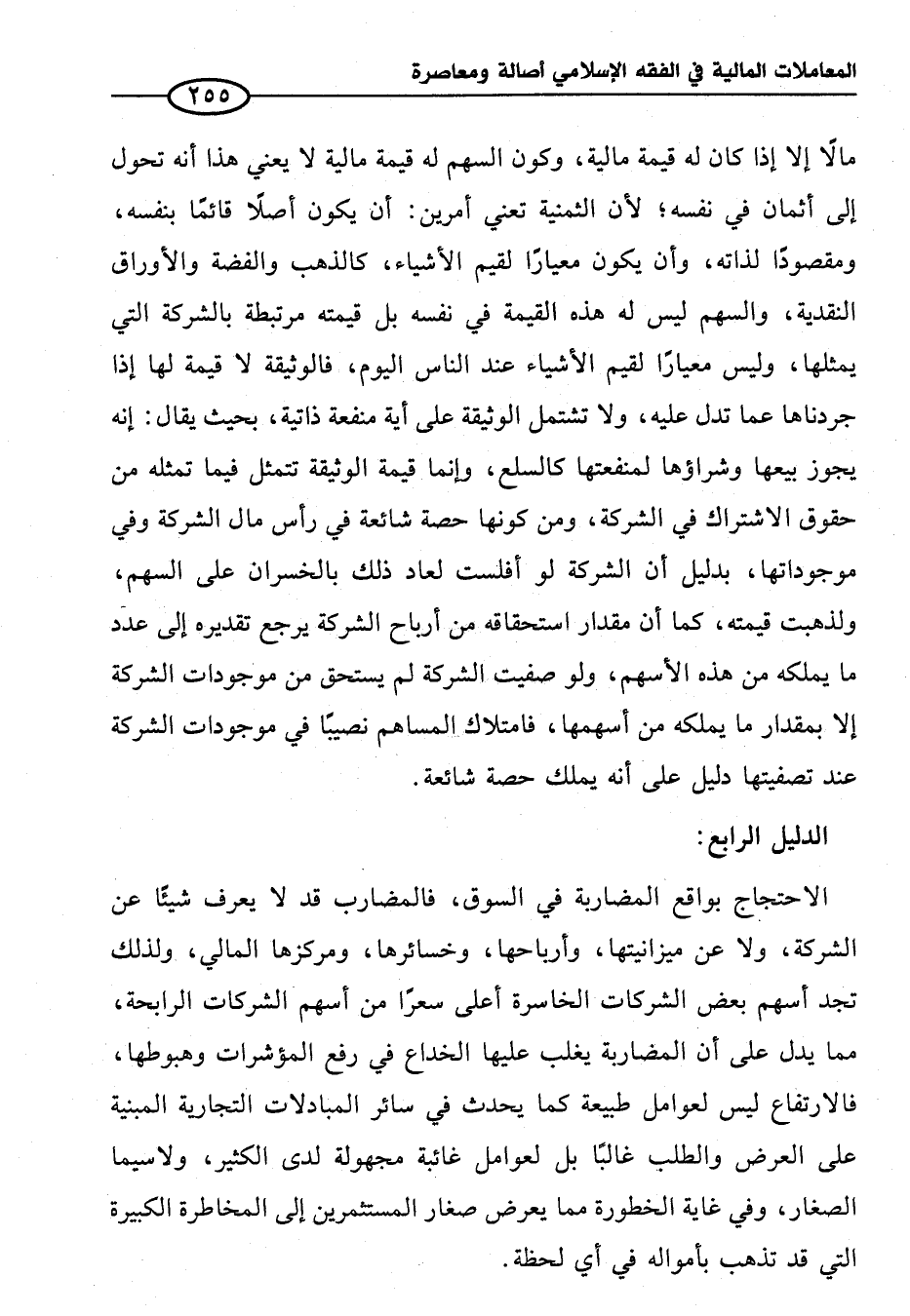 مالًا إلا إذا كان له قيمة مالية، وكون السهم له قيمة مالية لا يعني هذا أنه تحول إلى أثمان في نفسه؛ لأن الثمنية تعني أمرين: أن يكون أصلاً قائمًا بنفسه، ومقصودا لذاته، وأن يكون معيارا لقيم الأشياء، كالذهب والفضة والأوراق النقدية، والسهم ليس له هذه القيمة في نفسه بل قيمته مرتبطة بالشركة التي يمثلها؛ وليس معيارا لقيم الأشياء عند الناس اليوم، فالوثيقة لا قيمة لها إذا جردناها عما تدل عليه، ولا تشتمل الوثيقة على أية منفعة ذاتية، بحيث يقال: إنه يجوز بيعها وشراؤها لمنفعتها كالسلع، وإنما قيمة الوثيقة تتمثل فيما تمثله من حقوق الاشتراك في الشركة، ومن كونها حصة شائعة في رأس مال الشركة وفي موجوداتها، بدليل أن الشركة لو أفلست لعاد ذلك بالخسران على السهم، ولذهبت قيمته، كما أن مقدار استحقاقه من أرباح الشركة يرجع تقديره إلى عدد ما يملكه من هذه الأسهم، ولو صفيت الشركة لم يستحق من موجودات الشركة إلا بمقدار ما يملكه من أسهمها، فامتلاك المساهم نصيباً في موجودات الشركة عند تصفيتها دليل على أنه يملك حصة شائعة.