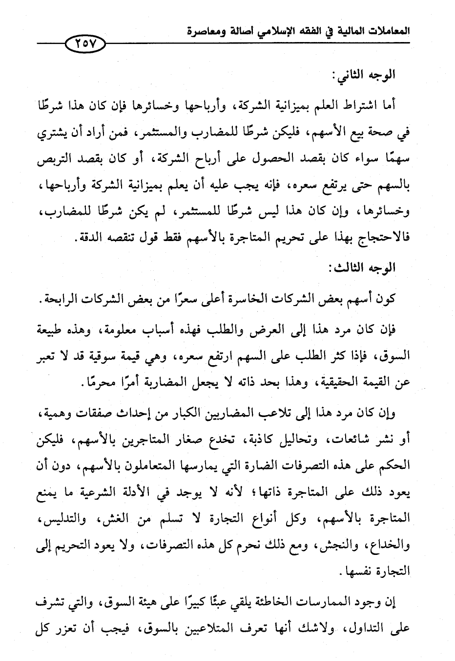 أما اشتراط العلم بميزانية الشركة، وأرباحها وخسائرها فإن كان هذا شرطًا في صحة بيع الأسهم، فليكن شرطًا للمضارب والمستثمر، فمن أراد أن يشتري سهمًا سواء كان بقصد الحصول على أرباح الشركة، أو كان بقصد التربص بالسهم حتى يرتفع سعره، فإنه يجب عليه أن يعلم بميزانية الشركة وأرباحها، وخسائرها، وإن كان هذا ليس شرطًا للمستثمر، لم يكن شرطًا للمضارب، فالاحتجاج بهذا على تحريم المتاجرة بالأسهم فقط قول تنقصه الدقة.