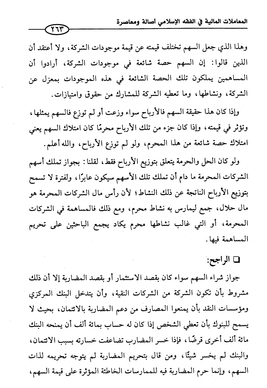 جواز شراء السهم سواء كان بقصد الاستثمار أو بقصد المضاربة إلا أن ذلك مشروط بأن تكون الشركة من الشركات النقية، وأن يتدخل البنك المركزي ومؤسسات النقد بأن يمنعوا المصارف من دعم المضاربة بالائتمان، بحيث لا يسمح للبنوك بأن تعطي الشخص إذا كان له حساب بمائة ألف أن يمنحه البنك مائة ألف أخرى قرضاً، فإذا خسر المضارب تضاعفت خسارته بسبب الائتمان، والبنك لم يخسر شيئًا، ومن قال بتحريم المضاربة لم يتوجه تحريمه لذات السهم، وإنما حرم المضاربة فيه للممارسات الخاطئة المؤثرة على قيمة السهم،