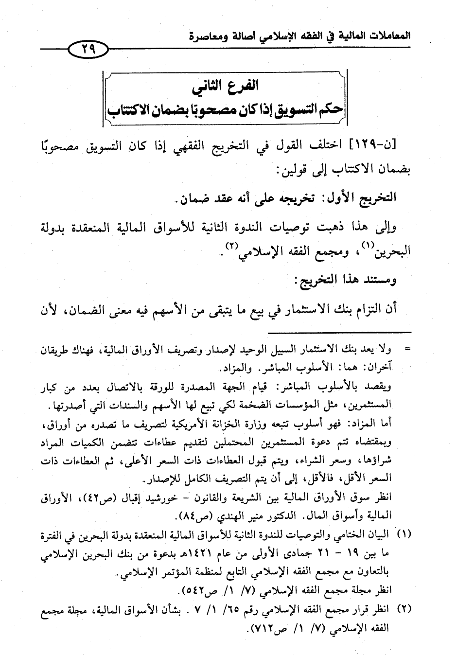 [ن - ١٢٩] اختلف القول في التخريج الفقهي إذا كان التسويق مصحوبًا بضمان الاكتتاب إلى قولين: