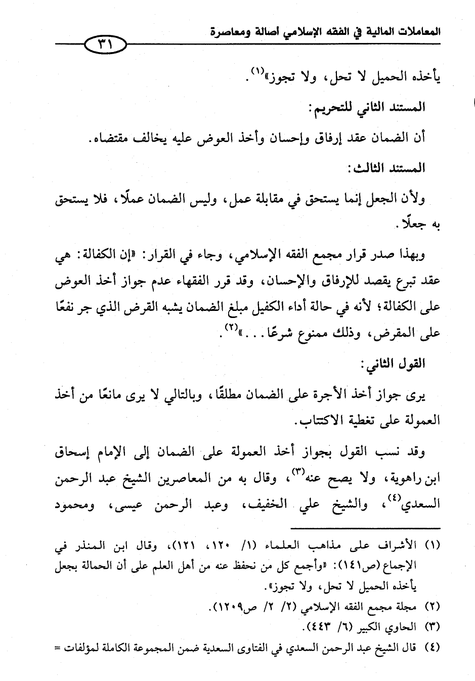وقد نسب القول بجواز أخذ العمولة على الضمان إلى الإِمام إسحاق ابن راهوية، ولا يصح عنه (¬٣)، وقال به من المعاصرين الشيخ عبد الرحمن السعدي (¬٤)، والشيخ علي الخفيف، وعبد الرحمن عيسى، ومحمود