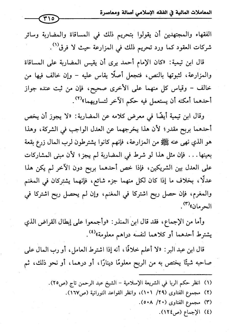 وقال ابن تيمية أيضاً في معرض كلامه عن المضاربة: "لا يجوز أن يخص أحدهما بربح مقدر؛ لأن هذا يخرجهما عن العدل الواجب في الشركة، وهذا هو الذي نهى عنه - صلى الله عليه وسلم - من المزارعة، فإنهم كانوا يشترطون لرب المال زرع بقعة بعينها ... فإن مثل هذا لو شرط في المضاربة لم يجز؛ لأن مبنى المشاركات على العدل بين الشريكين، فإذا خص أحدهما بربح دون الآخر لم يكن هذا عدلاً، بخلاف ما إذا كان لكل منهما جزء شائع، فإنهما يشتركان في المغنم والمغرم، فإن حصل ربح اشتركا في المغنم، وإن لم يحصل ربح اشتركا في الحرمان" (¬٣).