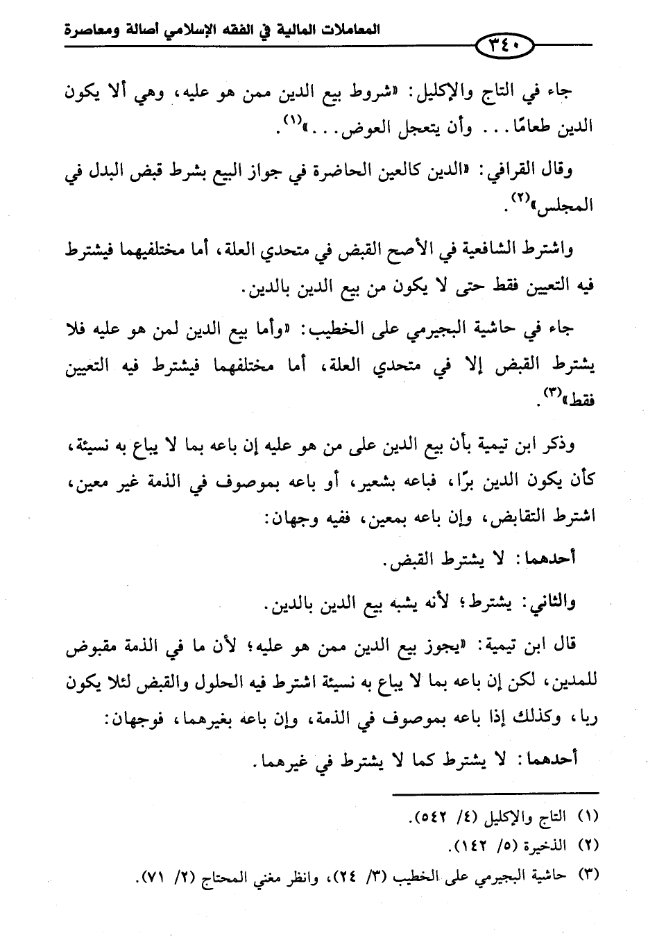 جاء في حاشية البجيرمي على الخطيب: "وأما بيع الدين لمن هو عليه فلا يشترط القبض إلا في متحدي العلة، أما مختلفهما فيشترط فيه التعيين فقط" (¬٣).