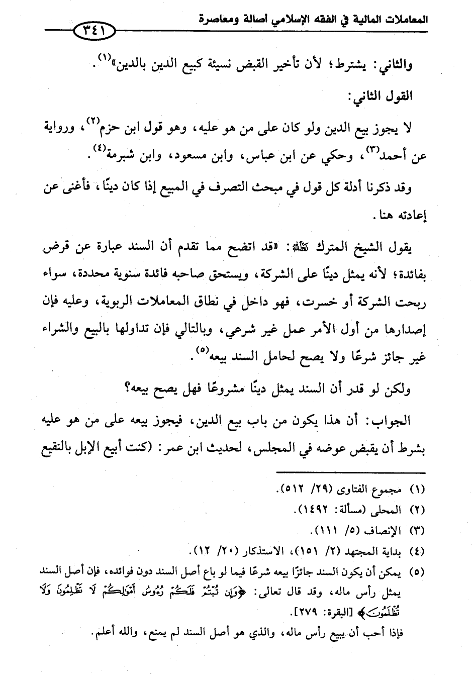 (¬٥) يمكن أن يكون السند جائزاً بيعه شرعاً فيما لو باع أصل السند دون فوائده، فإن أصل السند يمثل رأس ماله، وقد قال تعالى: {وَإِنْ تُبْتُمْ فَلَكُمْ رُءُوسُ أَمْوَالِكُمْ لَا تَظْلِمُونَ وَلَا تُظْلَمُونَ} [البقرة: ٢٧٩].