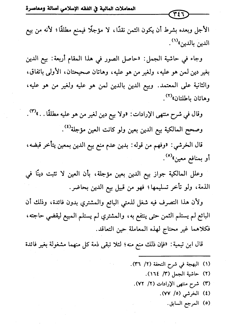 قال الخرشي: "وفهم من قوله: بدين عدم منع بيع الدين بمعين يتأخر قبضه، أو بمنافع معين" (¬٥).