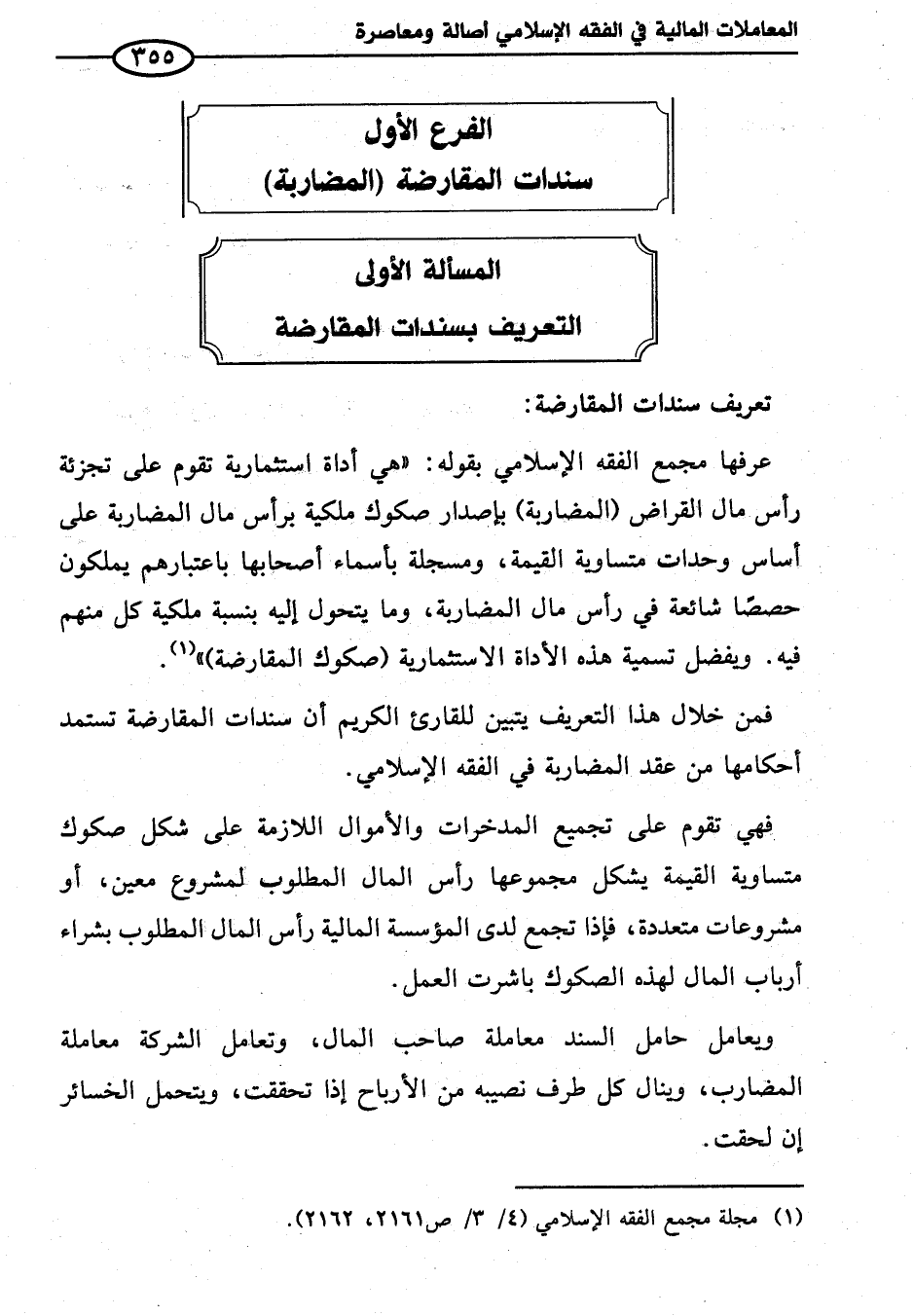 عرفها مجمع الفقه الإِسلامي بقوله: "هي أداة استثمارية تقوم على تجزئة رأس مال القراض (المضاربة) بإصدار صكوك ملكية برأس مال المضاربة على أساس وحدات متساوية القيمة، ومسجلة بأسماء أصحابها باعتبارهم يملكون حصصًا شائعة في رأس مال المضاربة، وما يتحول إليه بنسبة ملكية كل منهم فيه. ويفضل تسمية هذه الأداة الاستثمارية (صكوك المقارضة) " (¬١).