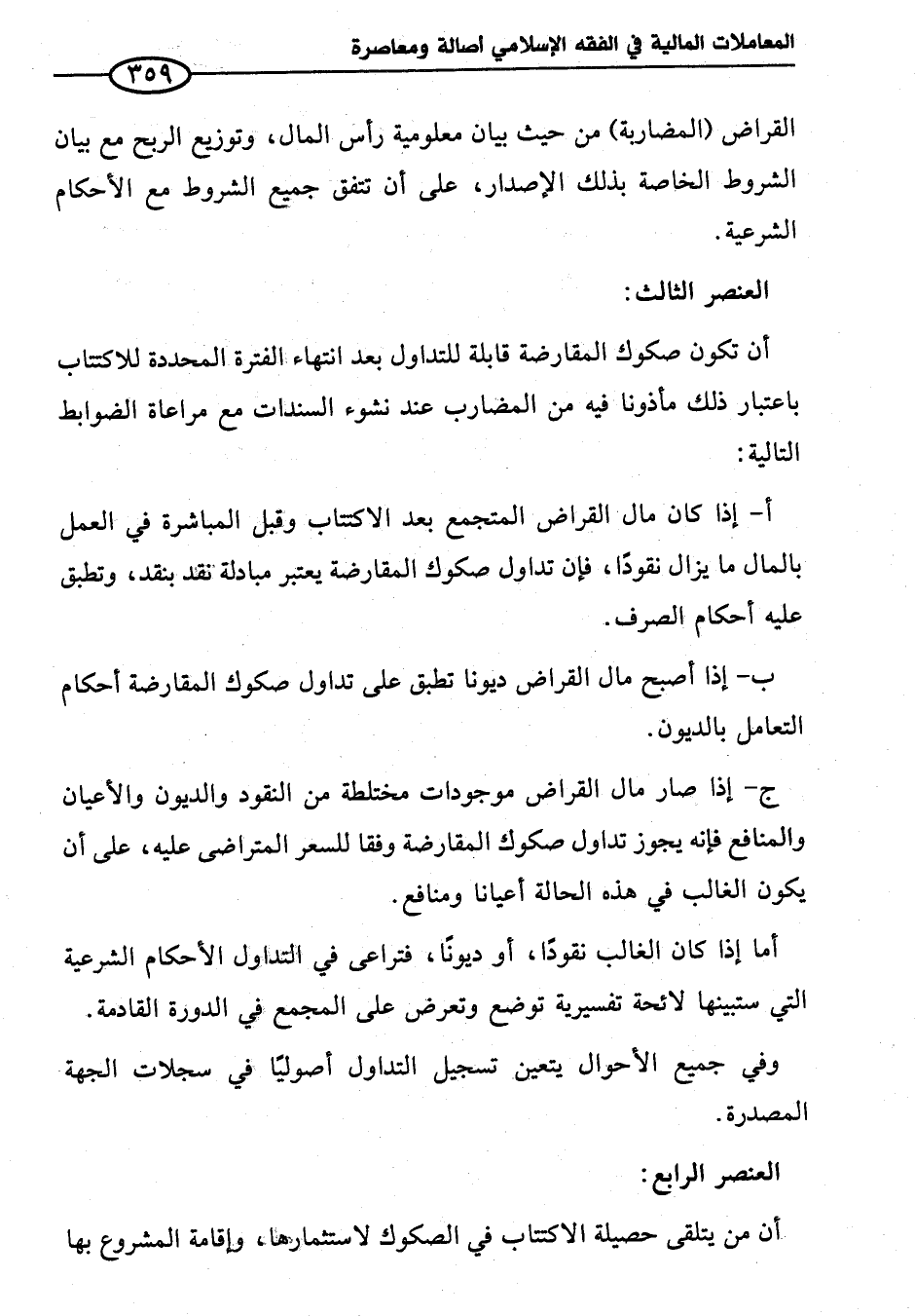 ج - إذا صار مال القراض موجودات مختلطة من النقود والديون والأعيان والمنافع فإنه يجوز تداول صكوك المقارضة وفقا للسعر المتراضى عليه، على أن يكون الغالب في هذه الحالة أعيانا ومنافع.