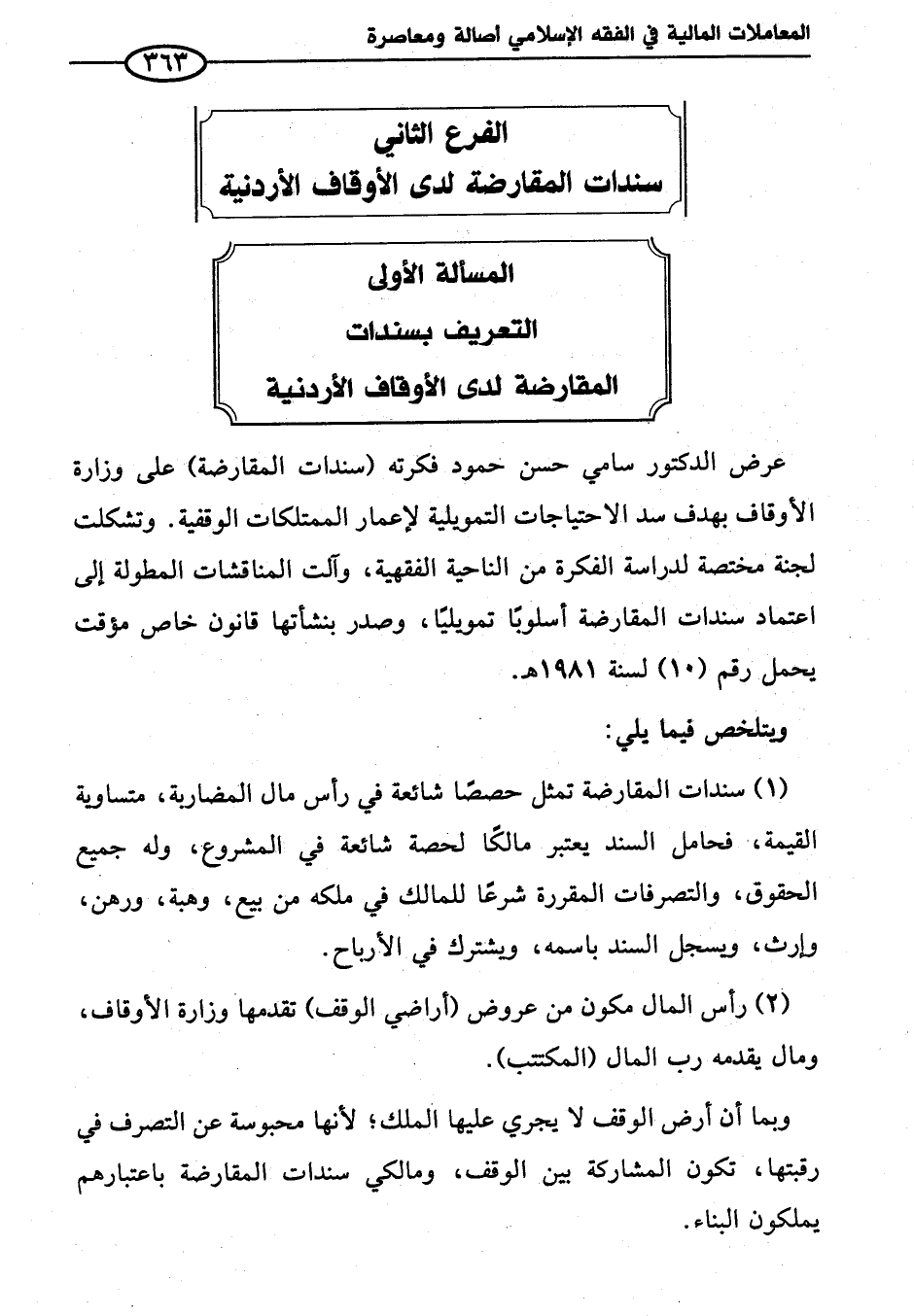 المسألة الأولى التعريف بسندات المقارضة لدى الأوقاف الآردنية