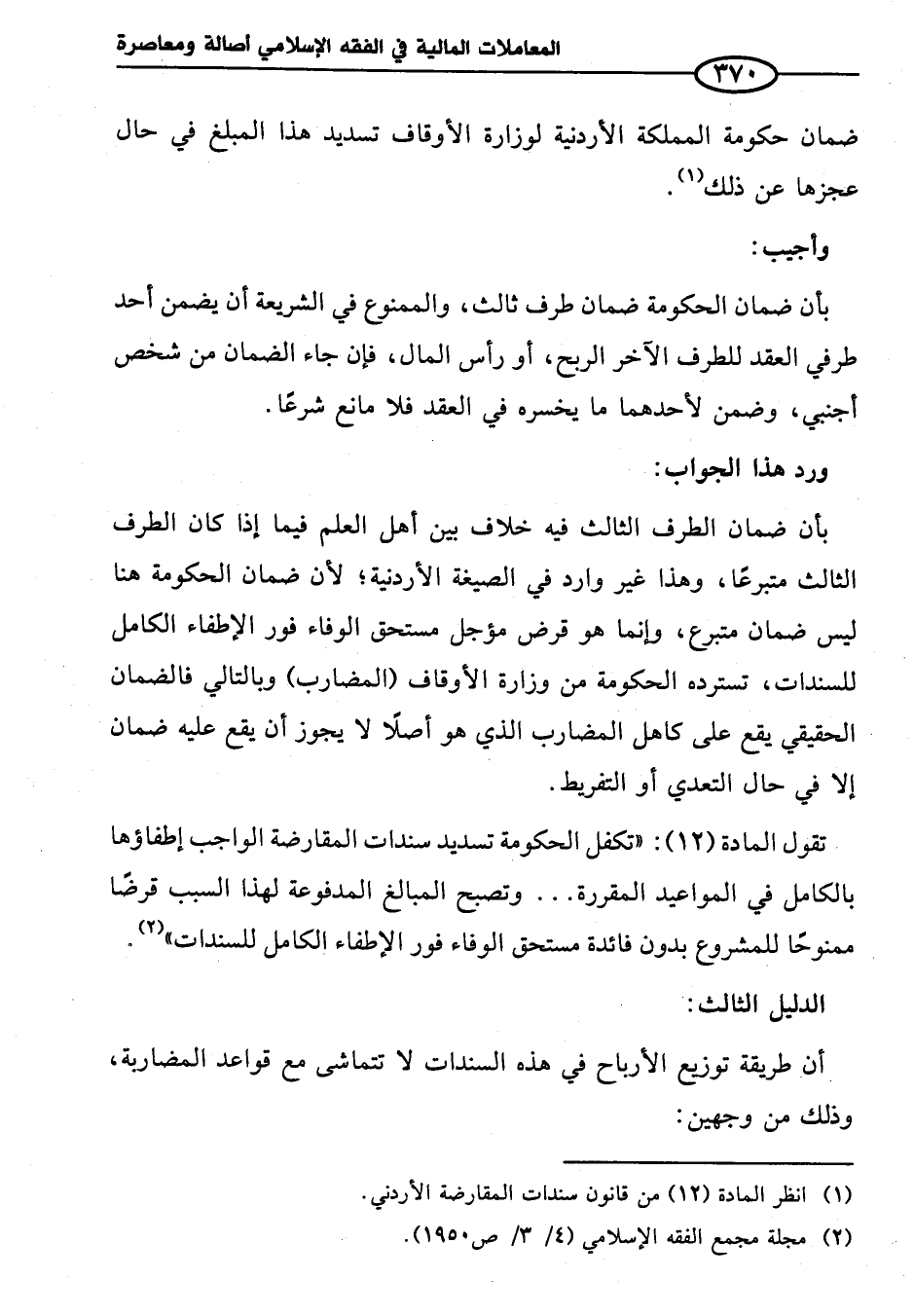 بأن ضمان الطرف الثالث فيه خلاف بين أهل العلم فيما إذا كان الطرف الثالث متبرعا، وهذا غير وارد في الصيغة الأردنية؛ لأن ضمان الحكومة هنا ليس ضمان متبرعا، وإنما هو قرض مؤجل مستحق الوفاء فور الإطفاء الكامل للسندات، تسترده الحكومة من وزارة الأوقاف (المضارب) وبالتالي فالضمان الحقيقي يقع على كاهل المضارب الذي هو أصلا لا يجوز أن يقع عليه ضمان إلا في حال التعدي أو التفريط.