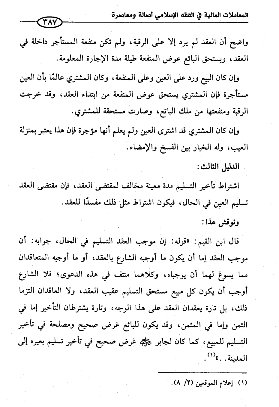 قال ابن القيم: "قوله: إن موجب العقد التسليم في الحال، جوابه: أن موجب العقد إما أن يكون ما أوجبه الشارع بالعقد، أو ما أوجبه المتعاقدان مما يسوغ لهما أن يوجباه، وكلاهما منتف في هذه الدعوى؛ فلا الشارع أوجب أن يكون كل مبيع مستحق التسليم عقيب العقد، ولا العاقدان التزما ذلك، بل تارة يعقدان العقد على هذا الوجه، وتارة يشترطان التأخير إما في الثمن وإما في المثمن، وقد يكون للبائع غرض صحيح ومصلحة في تأخير التسليم للمبيع، كما كان لجابر - رضي الله عنه - غرض صحيح في تأخير تسليم بعيره إلى المدينة .. " (¬١).