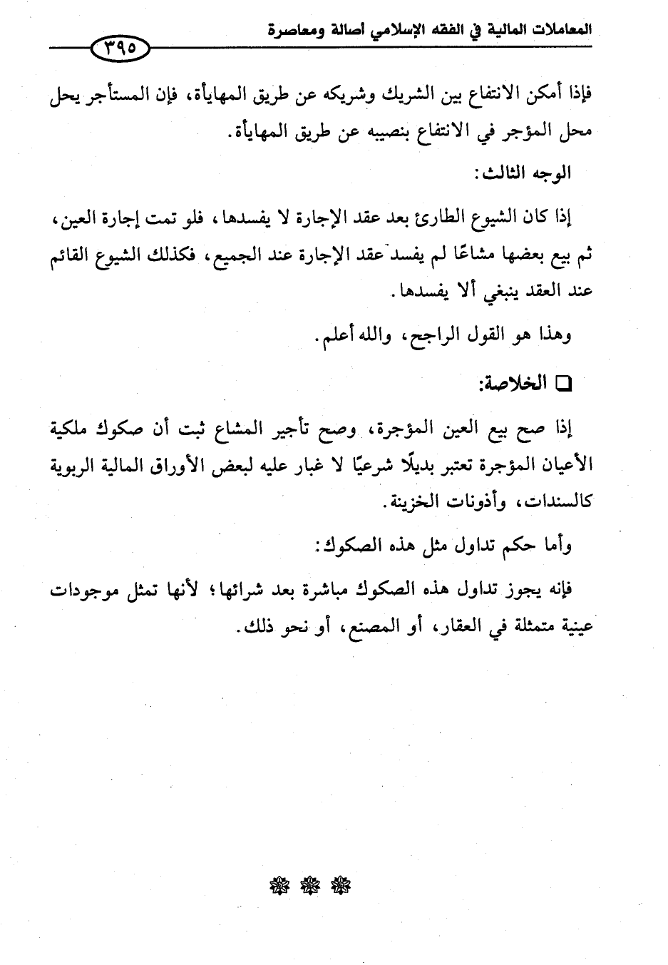 إذا صح بيع العين المؤجرة، وصح تأجير المشاع ثبت أن صكوك ملكية الأعيان المؤجرة تعتبر بديلا شرعيا لا غبار عليه لبعض الأوراق المالية الربوية كالسندات، وأذونات الخزينة.