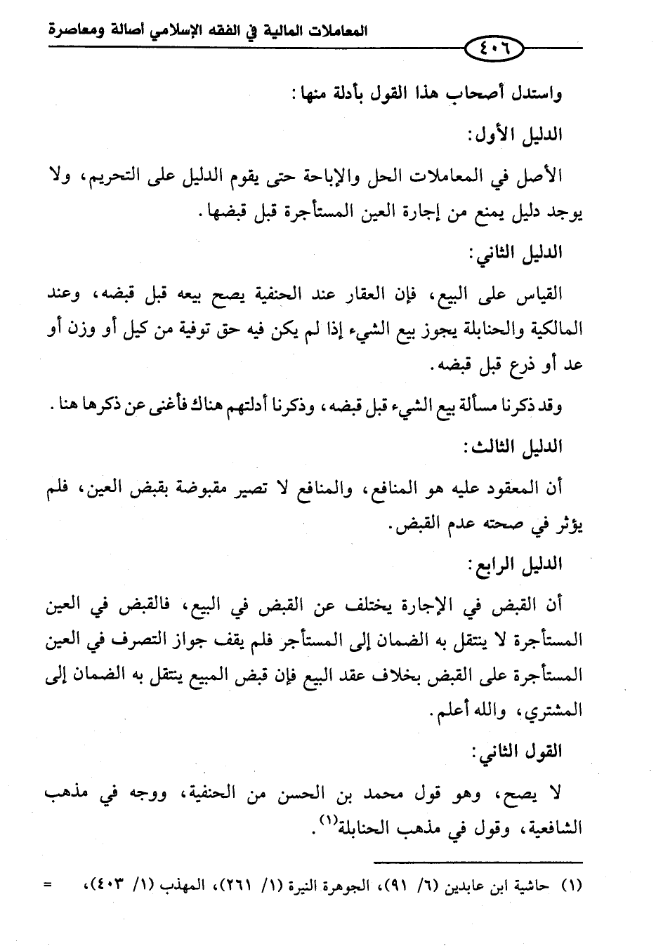 القياس على البيع، فإن العقار عند الحنفية يصح بيعه قبل قبضه، وعند المالكية والحنابلة يجوز بيع الشيء إذا لم يكن فيه حق توفية من كيل أو وزن أو عد أو ذرع قبل قبضه.