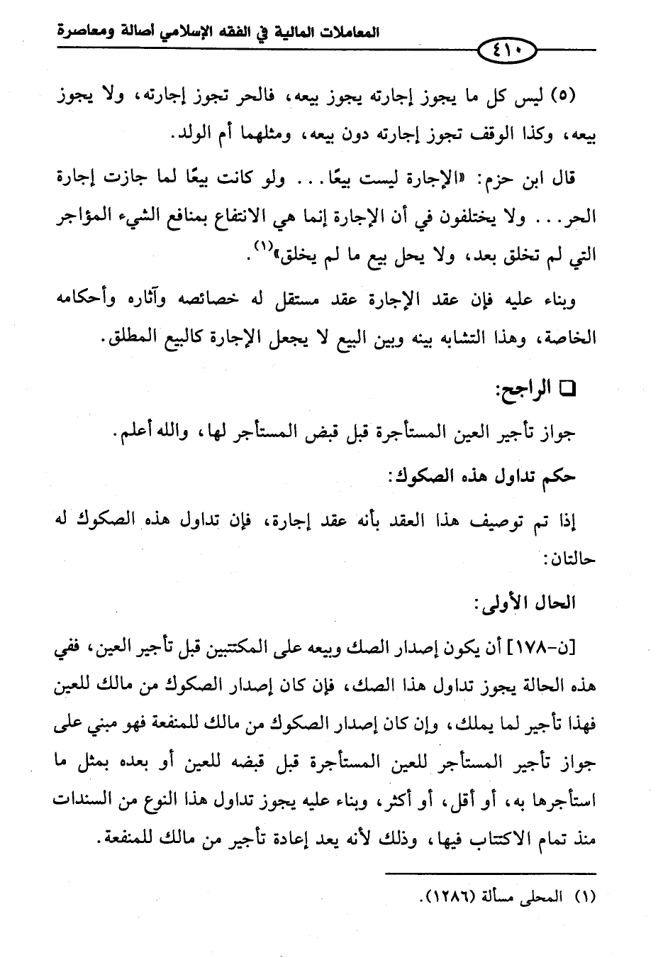 [ن -١٧٨] أن يكون إصدار الصك وبيعه على المكتتبين قبل تأجير العين، ففي هذه الحالة يجوز تداول هذا الصك، فإن كان إصدار الصكوك من مالك للعين فهذا تأجير لما يملك، وإن كان إصدار الصكوك من مالك للمنفعة فهو مبني على جواز تأجير المستأجر للعين المستأجرة قبل قبضه للعين أو بعده بمثل ما استأجرها به، أو أقل، أو أكثر، وبناء عليه يجوز تداول هذا النوع من السندات منذ تمام الاكتتاب فيها، وذلك لأنه يعد إعادة تأجير من مالك للمنفعة.