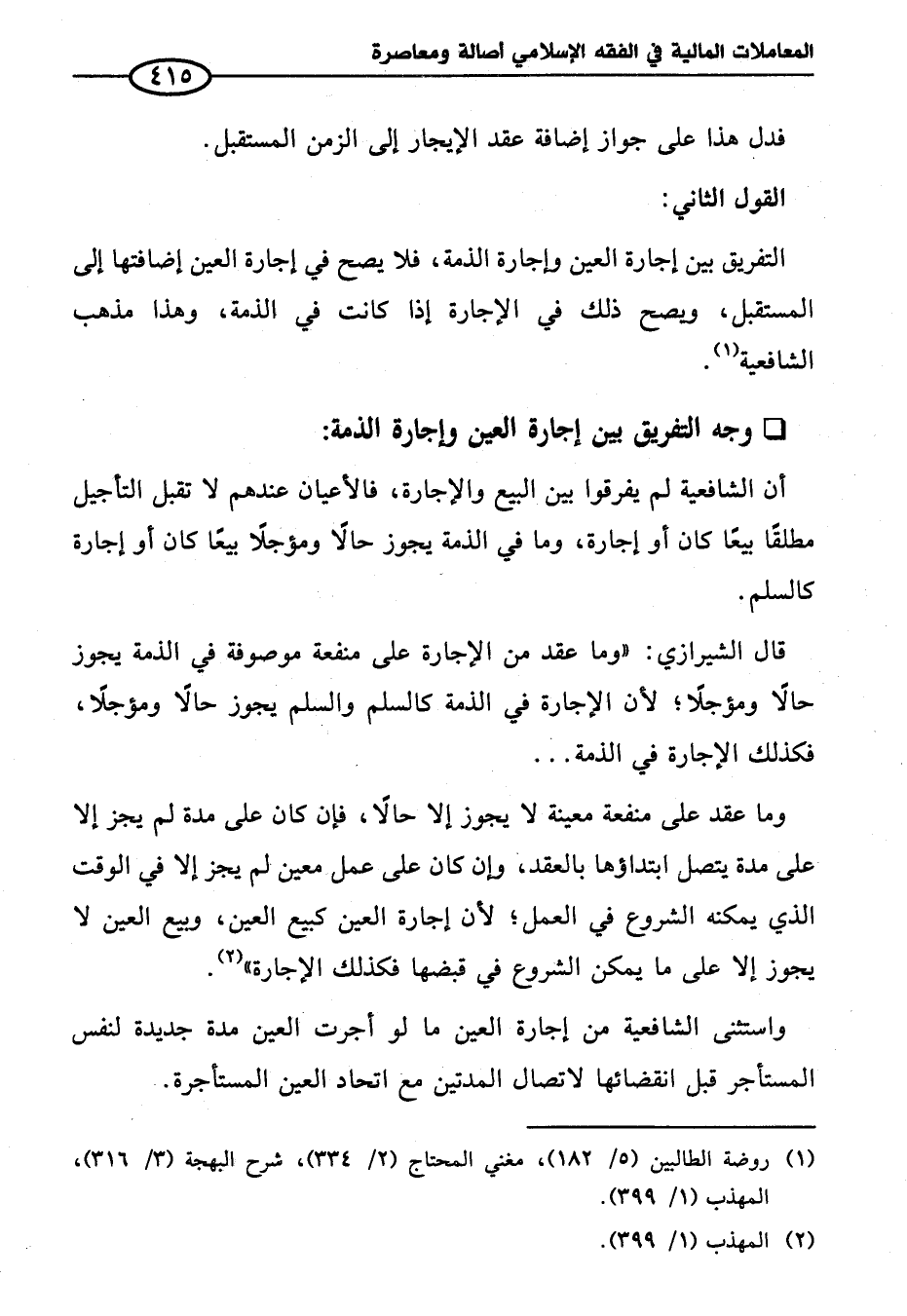 التفريق بين إجارة العين وإجارة الذمة، فلا يصح في إجارة العين إضافتها إلى المستقبل، ويصح ذلك في الإجارة إذا كانت في الذمة، وهذا مذهب الشافعية (¬١).