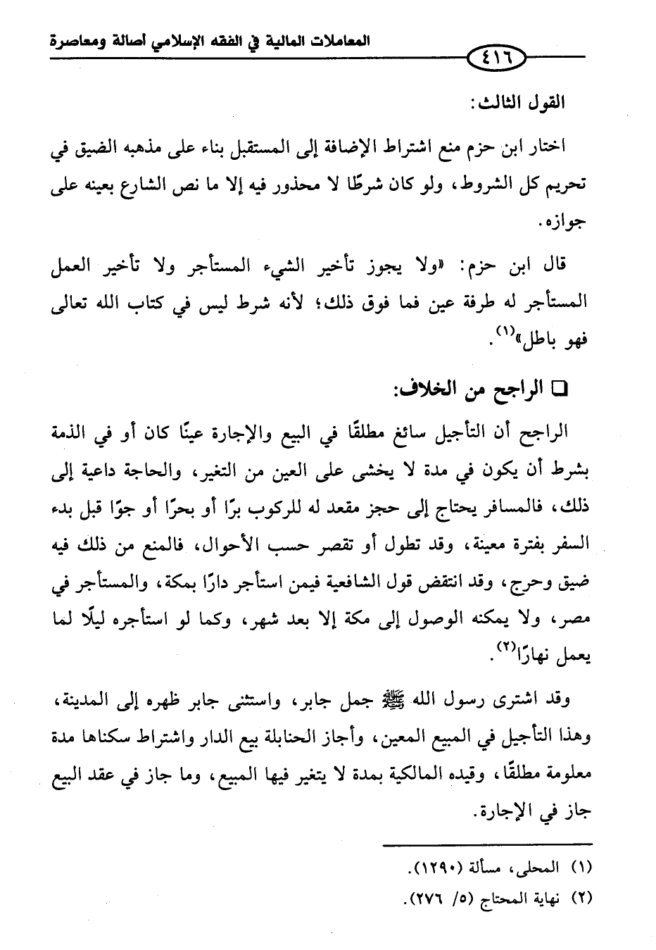 الراجح أن التأجيل سائغ مطلقاً في البيع والإجارة عينا كان أو في الذمة بشرط أن يكون في مدة لا يخشى على العين من التغير، والحاجة داعية إلى ذلك، فالمسافر يحتاج إلى حجز مقعد له للركوب برا أو بحرا أو جوا قبل بدء السفر بفترة معينة، وقد تطول أو تقصر حسب الأحوال، فالمنع من ذلك فيه ضيق وحرج، وقد انتقض قول الشافعية فيمن استأجر داراً بمكة، والمستأجر في مصر، ولا يمكنه الوصول إلى مكة إلا بعد شهر، وكما لو استأجره ليلا لما يعمل نهارا (¬٢).