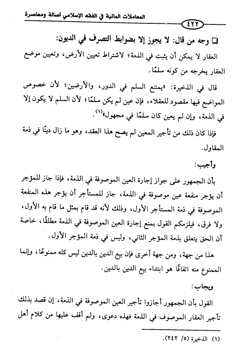 القول بأن الجمهور أجازوا تأجير العين الموصوفة في الذمة، إن قصد بذلك تأجير العقار الموصوف في الذمة فهذه دعوى، ولم أقف عليها من كلام أهل