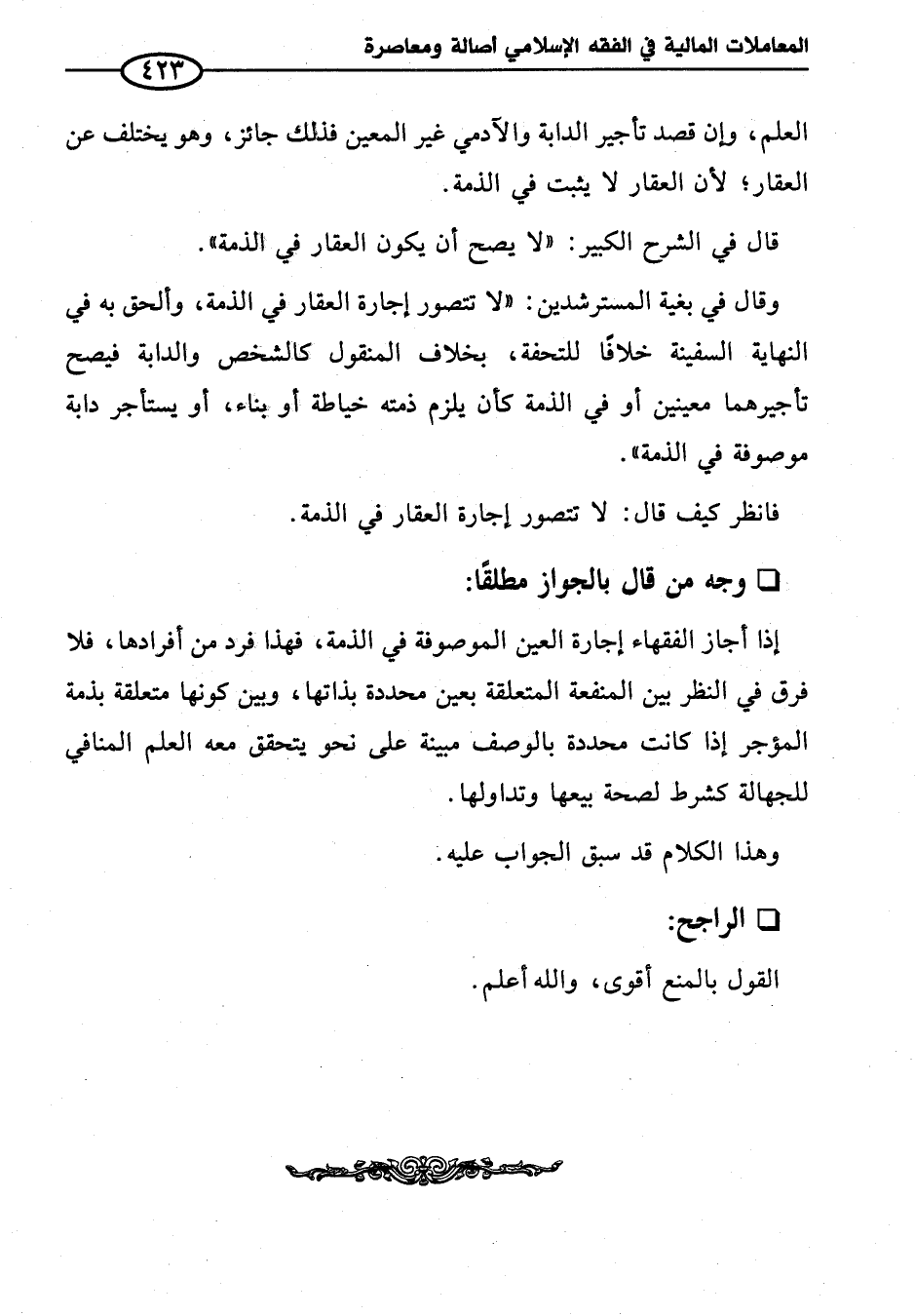 وقال في بغية المسترشدين: "لا تتصور إجارة العقار في الذمة، وألحق به في النهاية السفينة خلافًا للتحفة، بخلاف المنقول كالشخص والدابة فيصح تأجيرهما معينين أو في الذمة كأن يلزم ذمته خياطة أو بناء، أو يستأجر دابة موصوفة في الذمة".