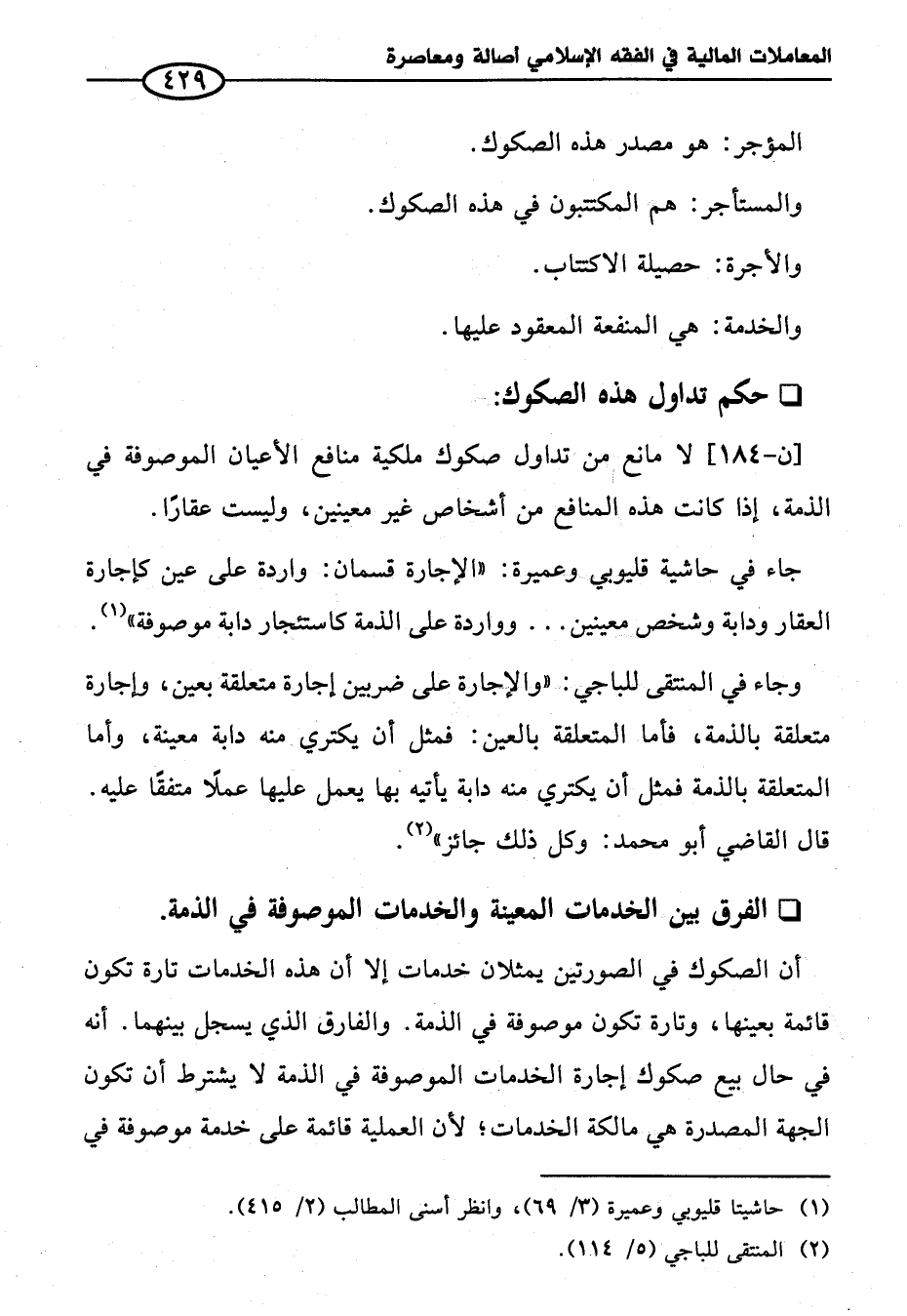 [ن - ١٨٤] لا مانع من تداول صكوك ملكية منافع الأعيان الموصوفة في الذمة، إذا كانت هذه المنافع من أشخاص غير معينين، وليست عقارا.