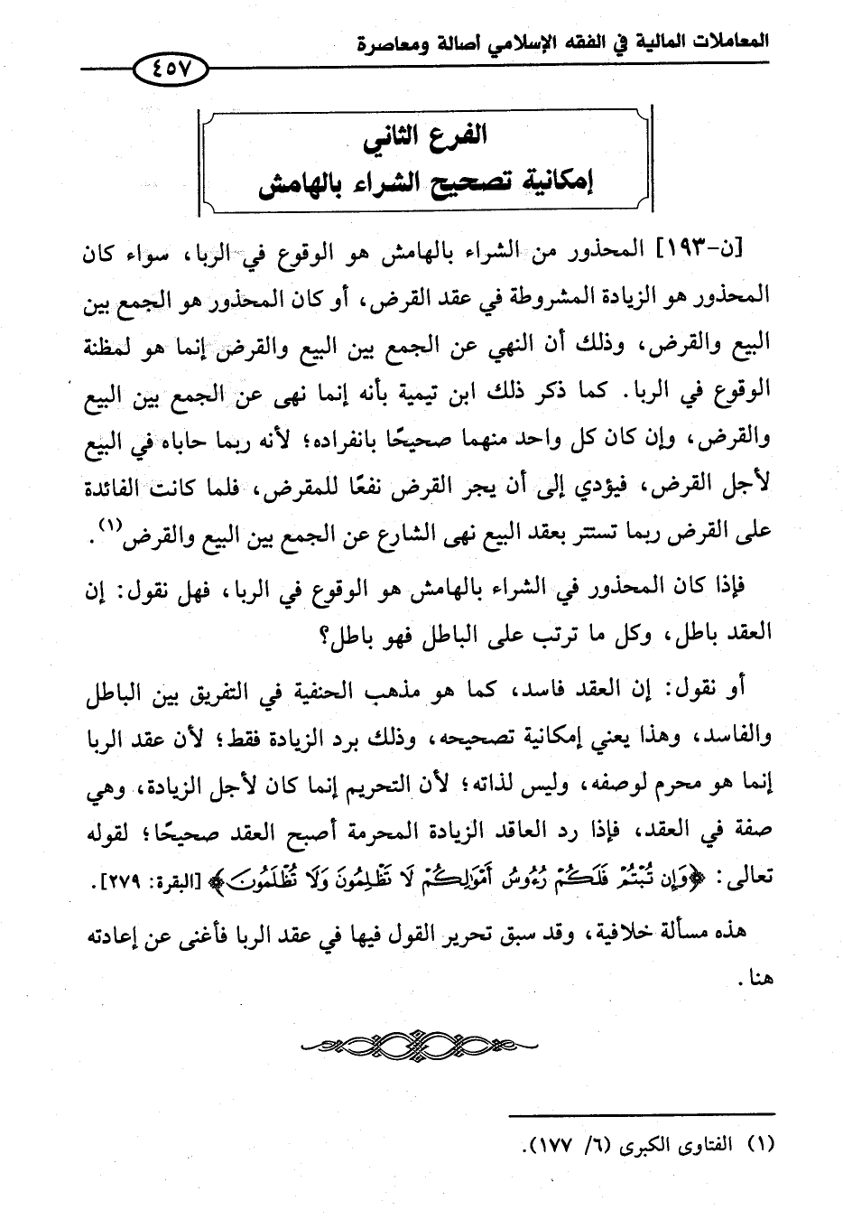 [ن -١٩٣] المحذور من الشراء بالهامش هو الوقوع في الربا، سواء كان المحذور هو الزيادة المشروطة في عقد القرض، أو كان المحذور هو الجمع بين البيع والقرض، وذلك أن النهي عن الجمع بين البيع والقرض إنما هو لمظنة الوقوع في الربا. كما ذكر ذلك ابن تيمية بأنه إنما نهى عن الجمع بين البيع والقرض، وإن كان كل واحد منهما صحيحا بانفراده؛ لأنه ربما حاباه في البيع لأجل القرض، فيؤدي إلى أن يجر القرض نفعاً للمقرض، فلما كانت الفائدة على القرض ربما تستتر بعقد البيع نهى الشارع عن الجمع بين البيع والقرض (¬١).