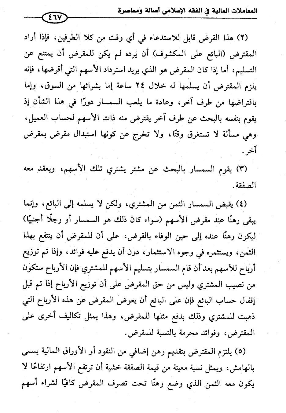 (٢) هذا القرض قابل للاستدعاء في أي وقت من كلا الطرفين، فإذا أراد المقترض (البائع على المكشوف) أن يرده لم يكن للمقرض أن يمتنع عن التسليم، أما إذا كان المقرض هو الذي يريد استرداد الأسهم التي أقرضها، فإنه يلزم المقترض أن يسلمها له خلال ٢٤ ساعة إما بشرائها من السوق، وإما باقتراضها من طرف آخر، وعادة ما يلعب السمسار دورًا في هذا الشأن إذ يقوم بنفسه بالبحث عن طرف آخر يقترض منه ذات الأسهم لحساب العميل، وهي مسألة لا تستغرق وقتًا, ولا تخرج عن كونها استبدال مقرض بمقرض آخر.