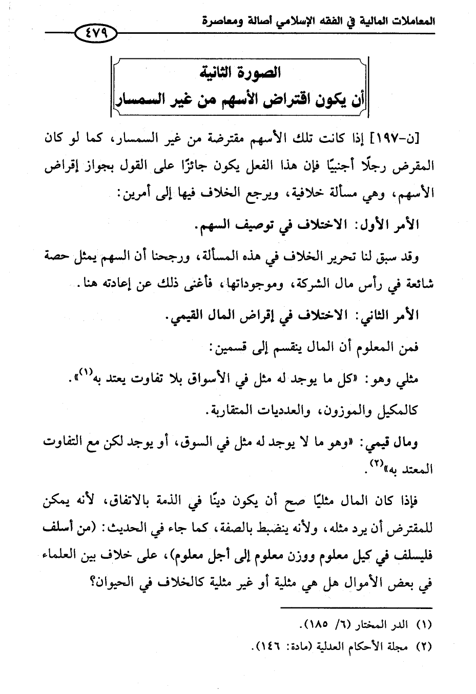 [ن -١٩٧] إذا كانت تلك الأسهم مقترضة من غير السمسار، كما لو كان المقرض رجلاً أجنبيًا فإن هذا الفعل يكون جائزاً على القول بجواز إقراض الأسهم، وهي مسألة خلافية، ويرجع الخلاف فيها إلى أمرين: