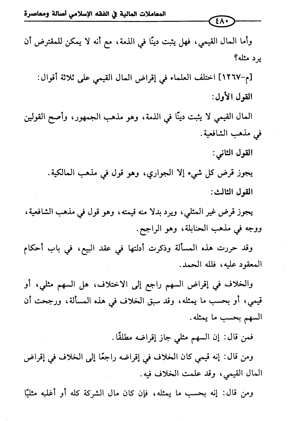 [م - ١٢٦٧] اختلف العلماء في إقراض المال القيمي على ثلاثة أقوال: