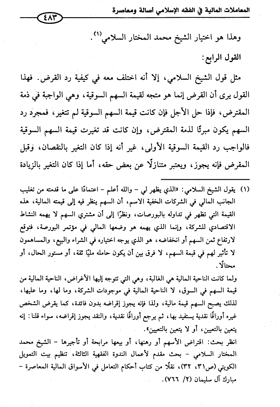 انظر بحث: اقتراض الأسهم أو رهنها، أو بيعها مرابحة أو تأجيرها -الشيخ محمَّد المختار السلامي- بحث مقدم لأعمال الندوة الفقهية الثالثة، تنظيم بيت التمويل الكويتي (ص ٣١، ٣٢)، نقلًا من كتاب أحكام التعامل في الأسواق المالية المعاصرة - مبارك آل سليمان (٢/ ٧٦٦).