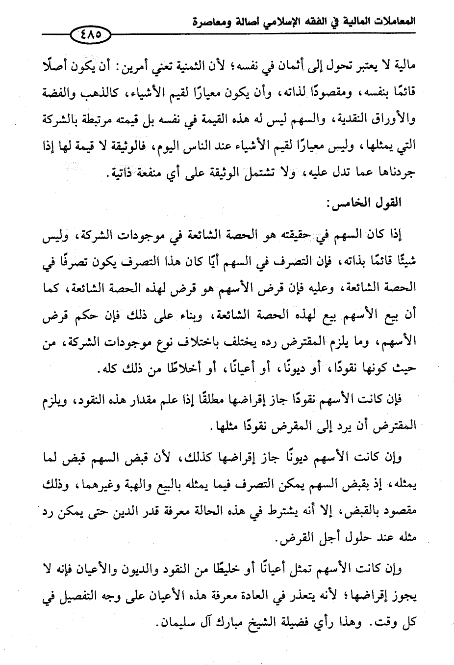 وإن كانت الأسهم تمثل أعيانًا أو خليطًا من النقود والديون والأعيان فإنه لا يجوز إقراضها؛ لأنه يتعذر في العادة معرفة هذه الأعيان على وجه التفصيل في كل وقت. وهذا رأي فضيلة الشيخ مبارك آل سليمان.