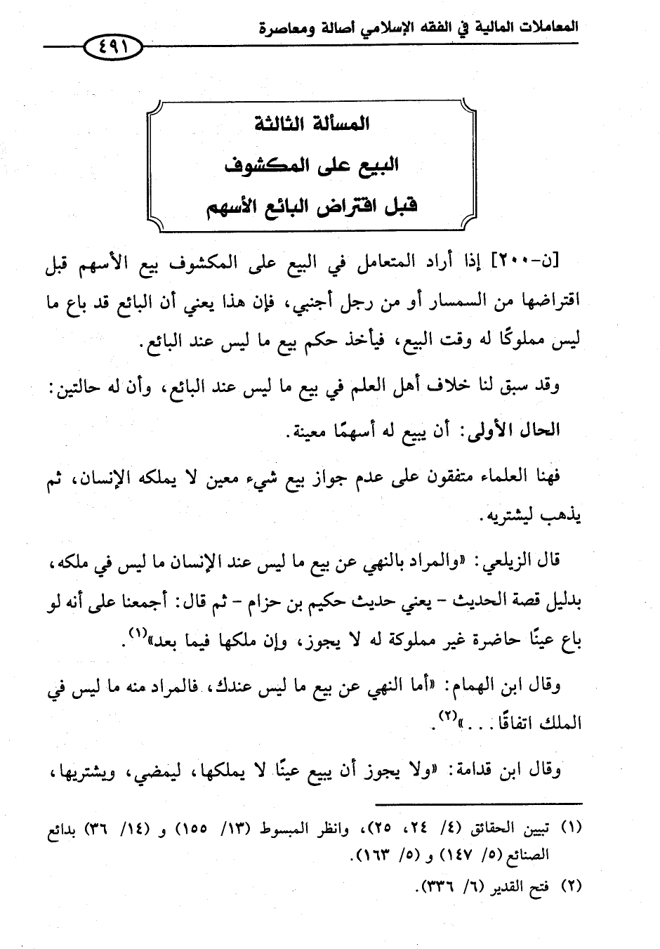 [ن -٢٠٠] إذا أراد المتعامل في البيع على المكشوف بيع الأسهم قبل اقتراضها من السمسار أو من رجل أجنبي، فإن هذا يعني أن البائع قد باع ما ليس مملوكًا له وقت البيع، فيأخذ حكم بيع ما ليس عند البائع.