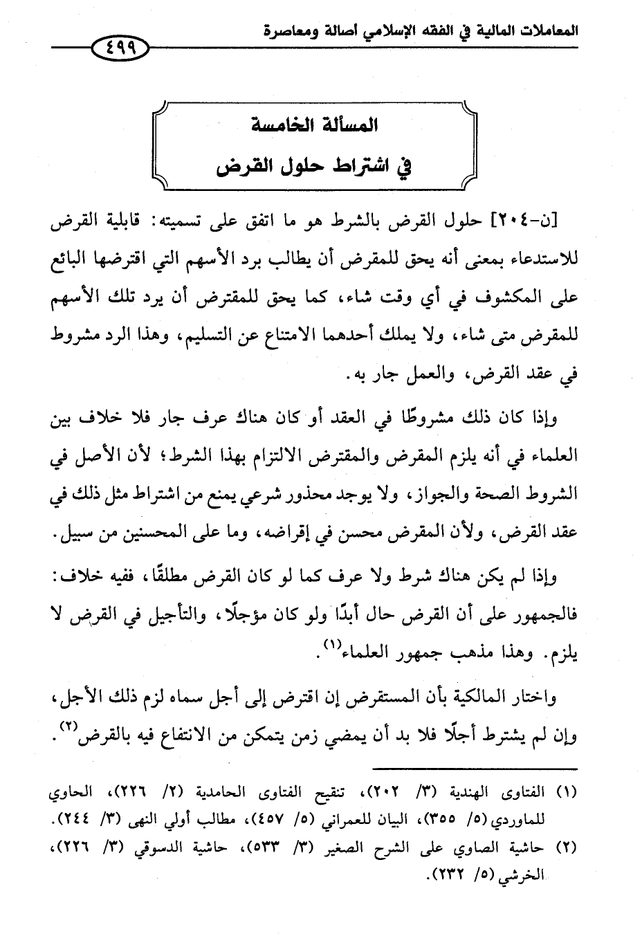 [ن -٢٠٤] حلول القرض بالشرط هو ما اتفق على تسميته: قابلية القرض للاستدعاء بمعنى أنه يحق للمقرض أن يطالب برد الأسهم التي اقترضها البائع على المكشوف في أي وقت شاء، كما يحق للمقترض أن يرد تلك الأسهم للمقرض متى شاء، ولا يملك أحدهما الامتناع عن التسليم، وهذا الرد مشروط في عقد القرض، والعمل جار به.