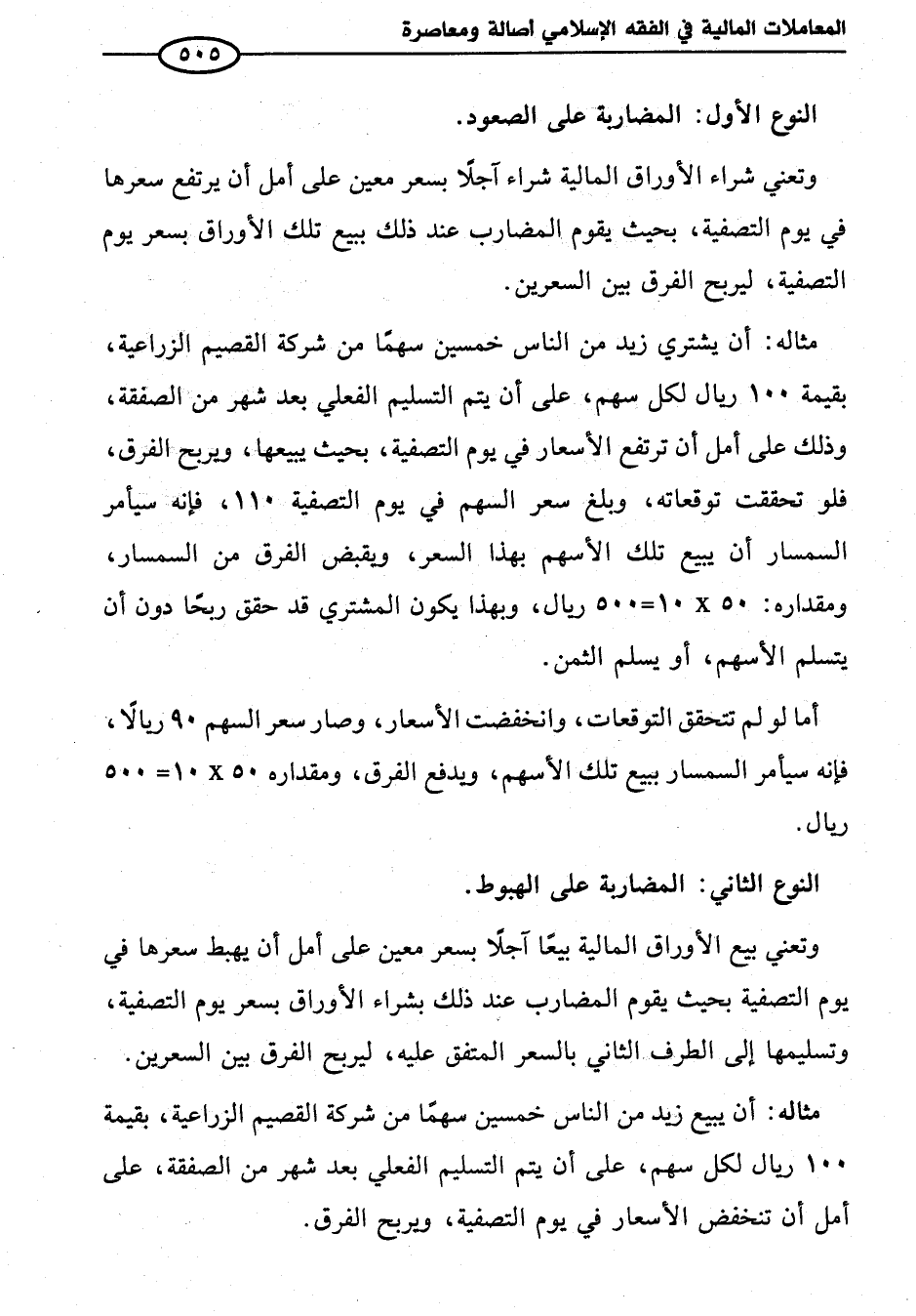 أما لو لم تتحقق التوقعات، وانخفضت الأسعار، وصار سعر السهم ٩٠ ريالًا، فإنه سيأمر السمسار ببيع تلك الأسهم، ويدفع الفرق، ومقداره ٥٠ × ١٠ = ٥٠٠ ريال.