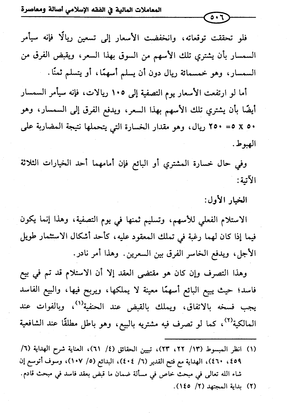 أما لو ارتفعت الأسعار يوم التصفية إلى ١٠٥ ريالات، فإنه سيأمر السمسار أيضًا بأن يشتري تلك الأسهم بهذا السعر، ويدفع الفرق إلى السمسار، وهو ٥٠ × ٥ = ٢٥٠ ريال، وهو مقدار الخسارة التي يتحملها نتيجة المضاربة على الهبوط.