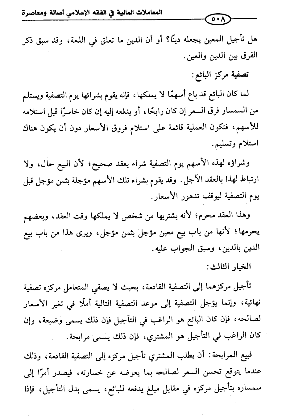 وشراؤه لهذه الأسهم يوم التصفية شراء بعقد صحيح؛ لأن البيع حال، ولا ارتباط لهذا بالعقد الآجل. وقد يقوم بشراء تلك الأسهم مؤجلة بثمن مؤجل قبل يوم التصفية ليوقف تدهور الأسعار.