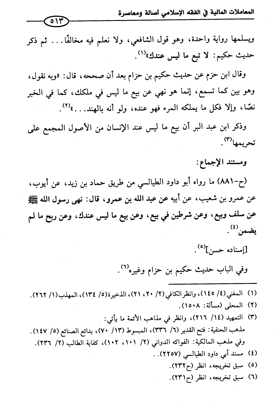 وقال ابن حزم عن حديث حكيم بن حزام بعد أن صححه، قال: "وبه نقول، وهو بين كما تسمع، إنما هو نهي عن بيع ما ليس في ملكك، كما في الخبر نصًا، وإلا فكل ما يملكة المرء فهو عنده، ولو أنه بالهند ... " (¬٢).