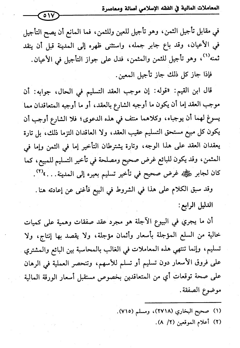 قال ابن القيم: "قوله: إن موجب العقد التسليم في الحال، جوابه: أن موجب العقد إما أن يكون ما أوجبه الشارع بالعقد، أو ما أوجبه المتعاقدان مما يسوغ لهما أن يوجباه، وكلاهما منتف في هذه الدعوى؛ فلا الشارع أوجب أن يكون كل مبيع مستحق التسليم عقيب العقد، ولا العاقدان التزما ذلك، بل تارة يعقدان العقد على هذا الوجه، وتارة يشترطان التأخير إما في الثمن وإما في المثمن، وقد يكون للبائع غرض صحيح ومصلحة في تأخير التسليم للمبيع، كما كان لجابر - رضي الله عنه - غرض صحيح في تأخير تسليم بعيره إلى المدينة ... " (¬٢).