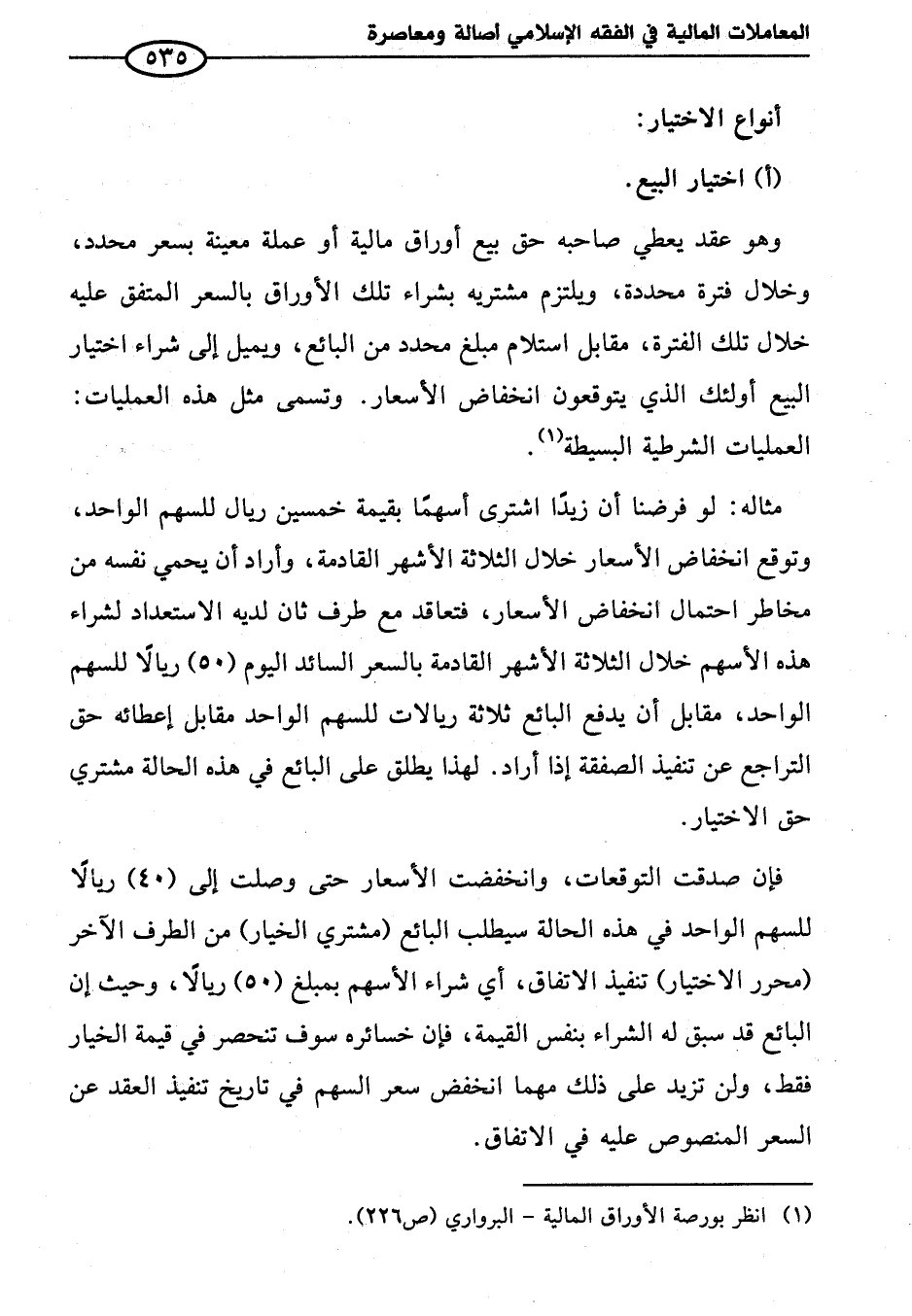 فإن صدقت التوقعات، وانخفضت الأسعار حتى وصلت إلى (٤٥) ريالًا للسهم الواحد في هذه الحالة سيطلب البائع (مشتري الخيار) من الطرف الآخر (محرر الاختيار) تنفيذ الاتفاق، أي شراء الأسهم بمبلغ (٥٠) ريالًا، وحيث إن البائع قد سبق له الشراء بنفس القيمة، فإن خسائره سوف تنحصر في قيمة الخيار فقط، ولن تزيد على ذلك مهما انخفض سعر السهم في تاريخ تنفيد العقد عن السعر المنصوص عليه في الاتفاق.