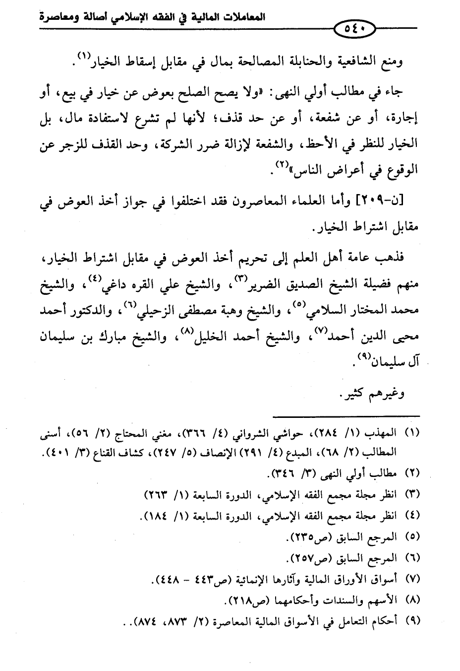 [ن -٢٠٩] وأما العلماء المعاصرون فقد اختلفوا في جواز أخذ العوض في مقابل اشتراط الخيار.