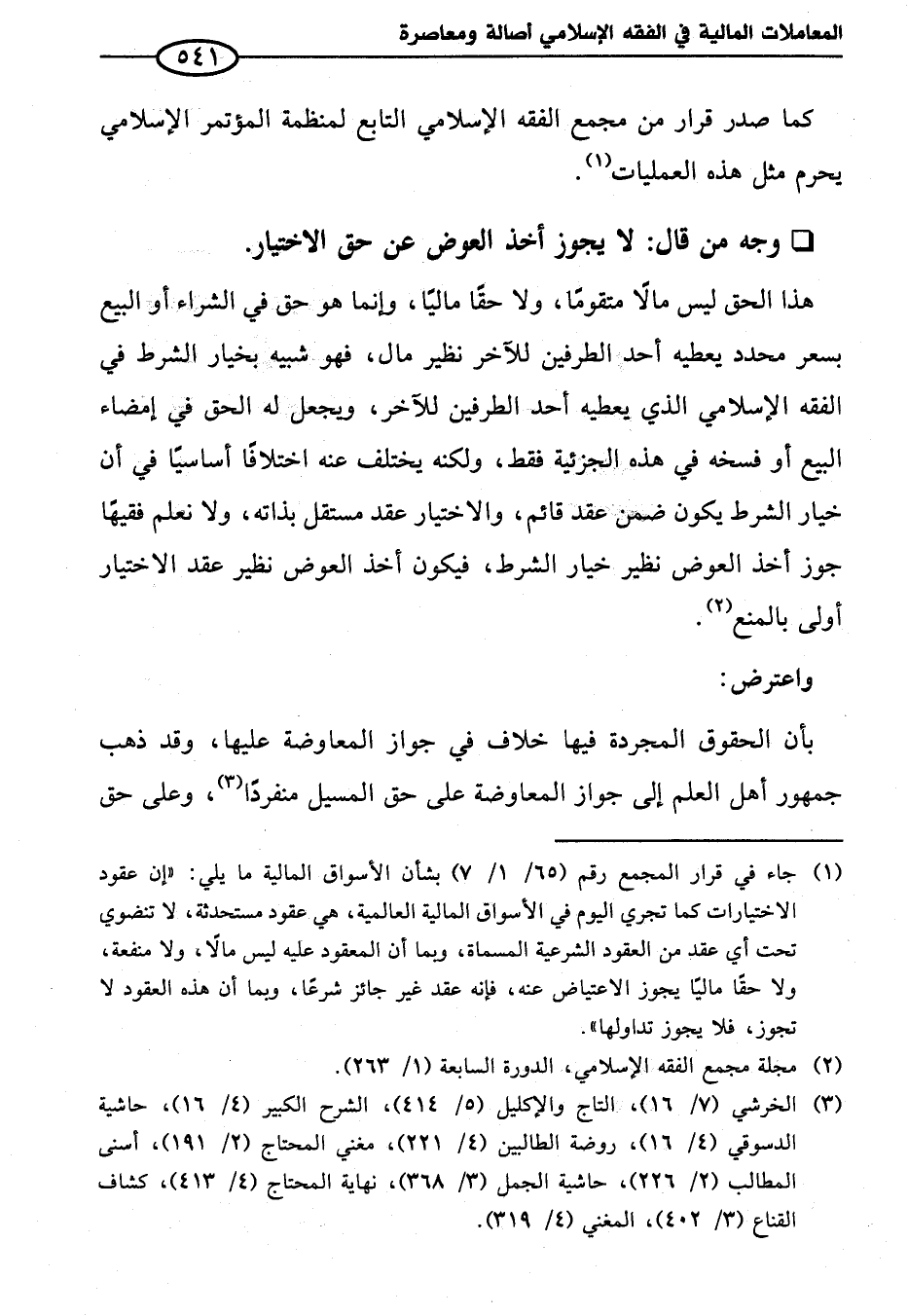 (¬١) جاء في قرار المجمع رقم (٦٥/ ١/ ٧) بشأن الأسواق المالية ما يلي: "إن عقود الاختيارات كما تجري اليوم في الأسواق المالية العالمية، هي عقود مستحدثة، لا تنضوي تحت أي عقد من العقود الشرعية المسماة، وبما أن المعقود عليه ليس مالًا, ولا منفعة، ولا حقًا ماليًا يجوز الاعتياض عنه، فإنه عقد غير جائز شرعًا، وبما أن هذه العقود لا تجوز، فلا يجوز تداولها".