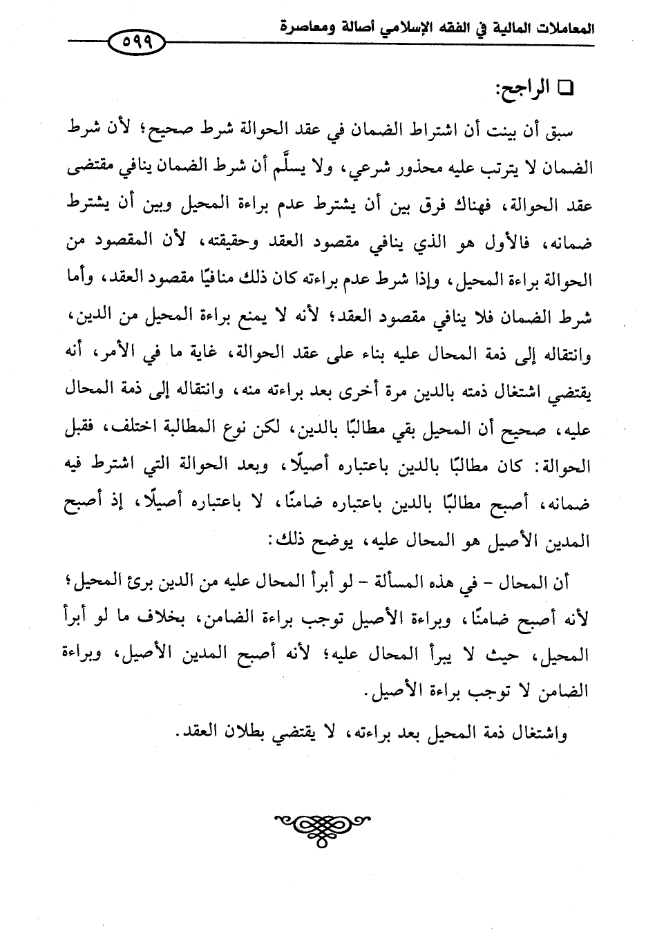 سبق أن بينت أن اشتراط الضمان في عقد الحوالة شرط صحيح؛ لأن شرط الضمان لا يترتب عليه محذور شرعي، ولا يسلَّم أن شرط الضمان ينافي مقتضى عقد الحوالة، فهناك فرق بين أن يشترط عدم براءة المحيل وبين أن يشترط ضمانه، فالأول هو الذي ينافي مقصود العقد وحقيقته؛ لأن المقصود من الحوالة براءة المحيل، وإذا شرط عدم براءته كان ذلك منافيًا مقصود العقد، وأما شرط الضمان فلا ينافي مقصود العقد؛ لأنه لا يمنع براءة المحيل من الدين، وانتقاله إلى ذمة المحال عليه بناء على عقد الحوالة، غاية ما في الأمر، أنه يقتضي اشتغال ذمته بالدين مرة أخرى بعد براءته منه، وانتقاله إلى ذمة المحال عليه، صحيح أن المحيل بقي مطالبًا بالدين، لكن نوع المطالبة اختلف، فقبل الحوالة: كان مطالبًا بالدين باعتباره أصيلًا، وبعد الحوالة التي اشترط فيه ضمانه، أصبح مطالبًا بالدين باعتباره ضامنًا، لا باعتباره أصيلًا، إذ أصبح المدين الأصيل هو المحال عليه، يوضح ذلك: