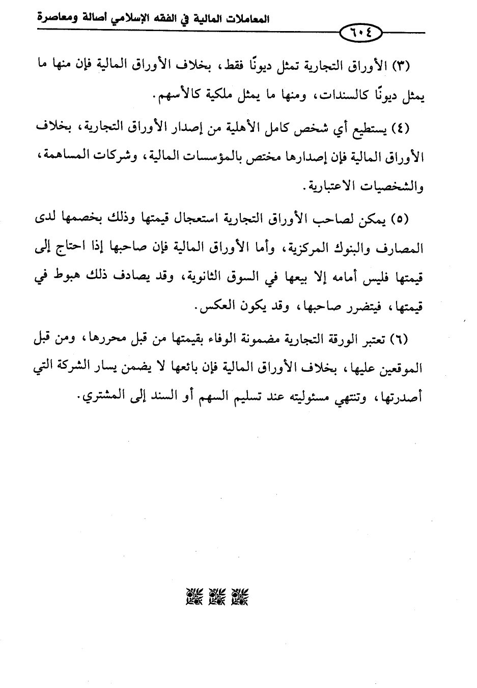 (٣) الأوراق التجارية تمثل ديونًا فقط، بخلاف الأوراق المالية فإن منها ما يمثل ديونًا كالسندات، ومنها ما يمثل ملكية كالأسهم.