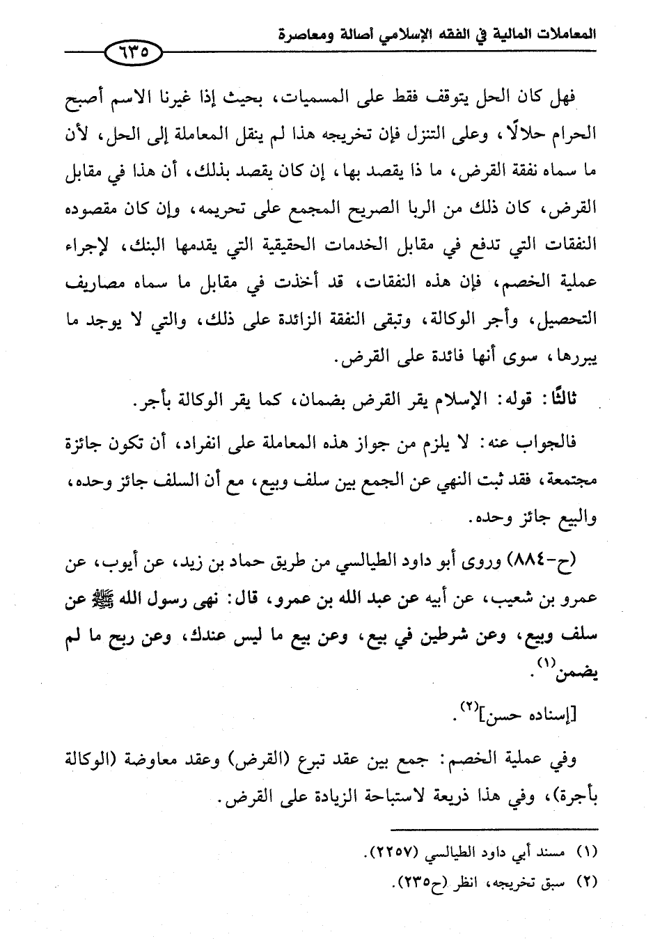 فهل كان الحل يتوقف فقط على المسميات، بحيث إذا غيرنا الاسم أصبح الحرام حلالًا، وعلى التنزل فإن تخريجه هذا لم ينقل المعاملة إلى الحل؛ لأن ما سماه نفقة القرض، ماذا يقصد بها، إن كان يقصد بذلك، أن هذا في مقابل القرض، كان ذلك من الربا الصريح المجمع على تحريمه، وإن كان مقصوده النفقات التي تدفع في مقابل الخدمات الحقيقية التي يقدمها البنك، لإجراء عملية الخصم، فإن هذه النفقات، قد أخذت في مقابل ما سماه مصاريف التحصيل، وأجر الوكالة، وتبقى النفقة الزائدة على ذلك، والتي لا يوجد ما يبررها، سوى أنها فائدة على القرض.