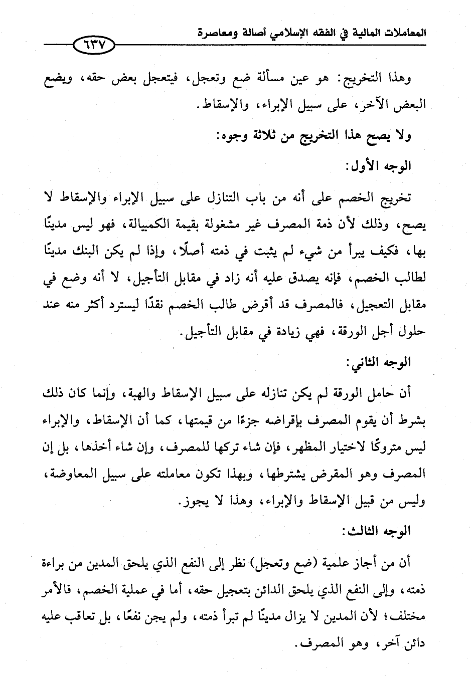 تخريج الخصم على أنه من باب التنازل على سبيل الإبراء والإسقاط لا يصح، وذلك لأن ذمة المصرف غير مشغولة بقيمة الكمبيالة، فهو ليس مدينًا بها، فكيف يبرأ من شيء لم يثبت في ذمته أصلًا، وإذا لم يكن البنك مدينًا لطالب الخصم، فإنه يصدق عليه أنه زاد في مقابل التأجيل، لا أنه وضع في مقابل التعجيل، فالمصرف قد أقرض طالب الخصم نقدًا ليسترد أكثر منه عند حلول أجل الورقة، فهي زيادة في مقابل التأجيل.