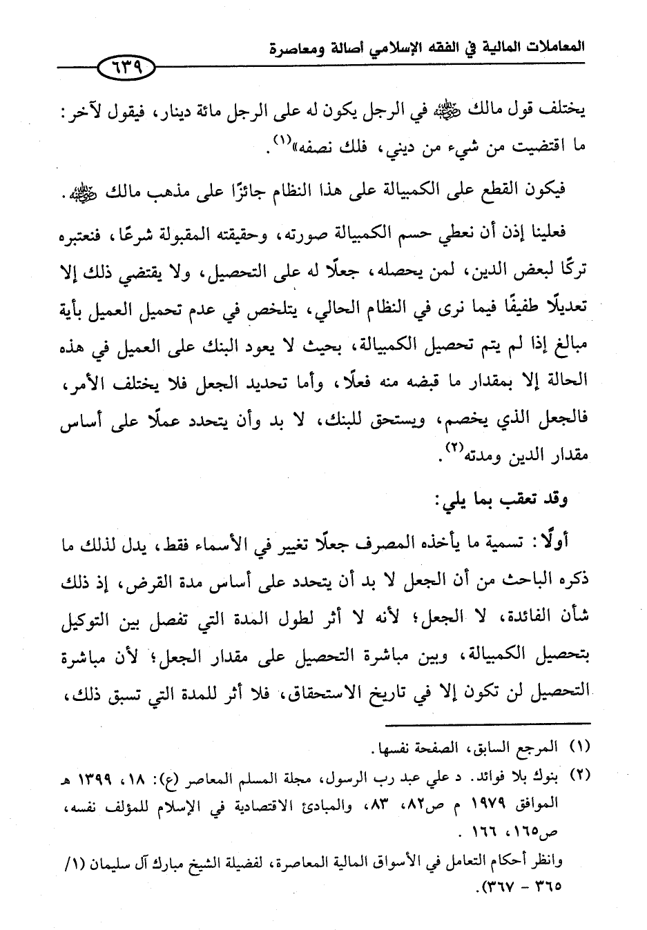 أولًا: تسمية ما يأخذه المصرف جعلًا تغيير في الأسماء فقط، يدل لذلك ما ذكره الباحث من أن الجعل لا بد أن يتحدد على أساس مدة القرض، إذ ذلك شأن الفائدة، لا الجعل؛ لأنه لا أثر لطول المدة التي تفصل بين التوكيل بتحصيل الكمبيالة، وبين مباشرة التحصيل على مقدار الجعل؛ لأن مباشرة التحصيل لن تكون إلا في تاريخ الاستحقاق، فلا أثر للمدة التي تسبق ذلك،