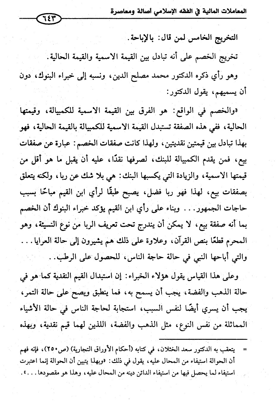 "والخصم في الواقع: هو الفرق بين القيمة الاسمية للكمبيالة، وقيمتها الحالية، ففي هذه الصفقة تستبدل القيمة الاسمية للكمبيالة بالقيمة الحالية، فهو بهذا تبادل بين قيمتين نقديتين، ولهذا كانت صفقات الخصم: عبارة عن صفقات بيع، فإن يقدم الكمبيالة للبنك، لصرفها نقدًا، عليه أن يقبل ما هو أقل من قيمتها الاسمية، والزيادة التي يكسبها البنك: هي بلا شك عن ربا , ولكنه يتعلق بصفقات بيع، لهذا فهو ربا فضل، يصبح طبقًا لرأي ابن القيم مباحًا بسبب حاجات الجمهور ... وبناء على رأي ابن القيم يؤكد خبراء البنوك أن الخصم بما أنه صفقة بيع، لا يمكن أن يندرج تحت تعريف الربا من نوع النسيئة، وهو المحرم قطعًا بنص القرآن، وعلاوة على ذلك هم يشيرون إلى حالة العرايا ... والتي أباحها النبي في حالة حاجة الناس، للحصول على الرطب ..