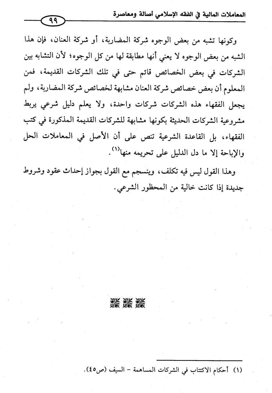 وكونها تشبه من بعض الوجوه شركة المضاربة، أو شركة العنان، فإن هذا الشبه من بعض الوجوه لا يعني أنها مطابقة لها من كل الوجوه؛ لأن التشابه بين الشركات في بعض الخصائص قائم حتى في تلك الشركات القديمة، فإن المعلوم أن بعض خصائص شركة العنان مشابهة لخصائص شركة المضاربة، ولم يجعل الفقهاء هذه الشركات شركات واحدة، ولا يعلم دليل شرعي يربط مشروعية الشركات الحديثة بكونها مشابهة للشركات القديمة المذكورة في كتب الفقهاء، بل القاعدة الشرعية تنص على أن الأصل في المعاملات الحل والإباحة إلا ما دل الدليل على تحريمه منها (¬١).