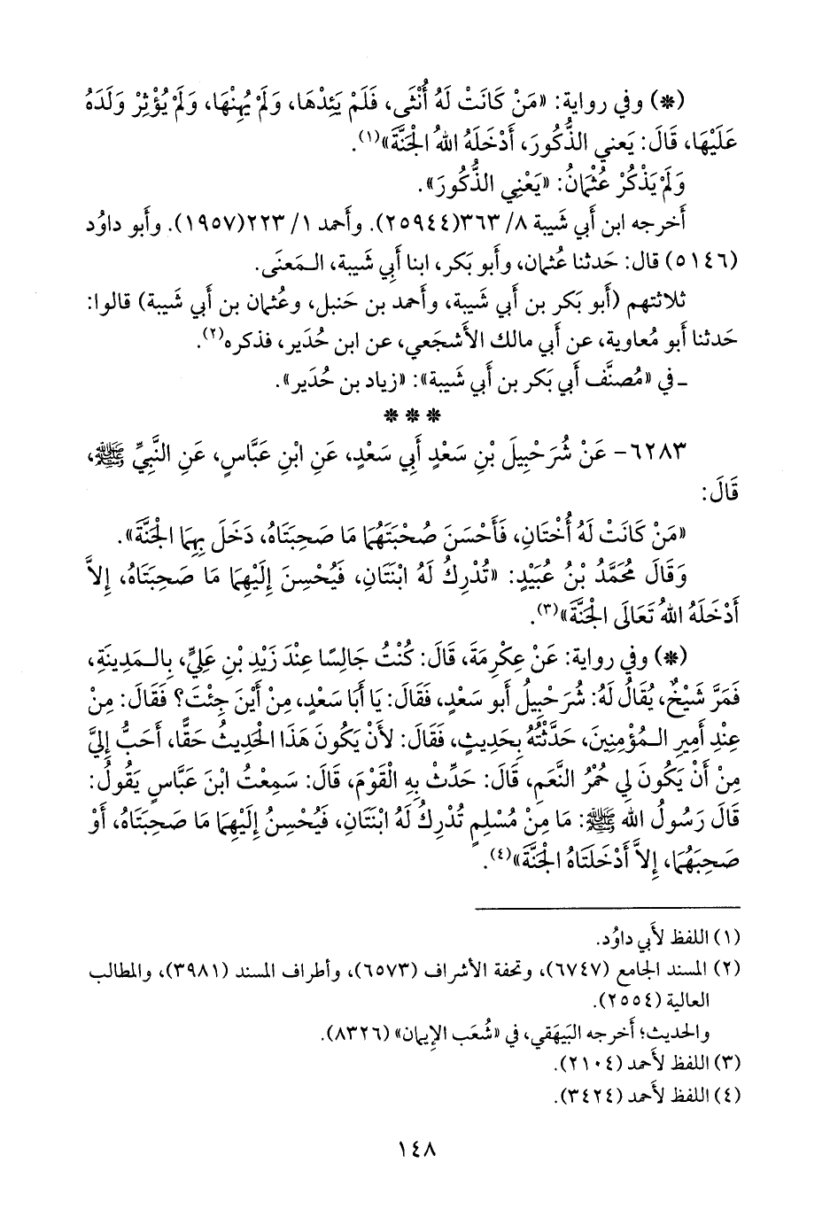 - وفي رواية: عن عكرمة, قال: كنت جالسا عند زيد بن علي، بالمدينة, فمر شيخ، يقال له: شرحبيل أَبو سعد, فقال: يا أبا سعد, من أين جئت؟ فقال: من عند أمير المؤمنين, حدثته بحديث, فقال: لأن يكون هذا الحديث حقا, أحب إلي من أن يكون لي حمر النعم, قال: حدث به القوم, قال: سمعت ابن عباس يقول: قال رسول الله صَلى الله عَليه وسَلم: ما من مسلم تدرك له ابنتان, فيحسن إليهما ما صحبتاه, أو صحبهما, إلا أدخلتاه الجنة» (¬٢).