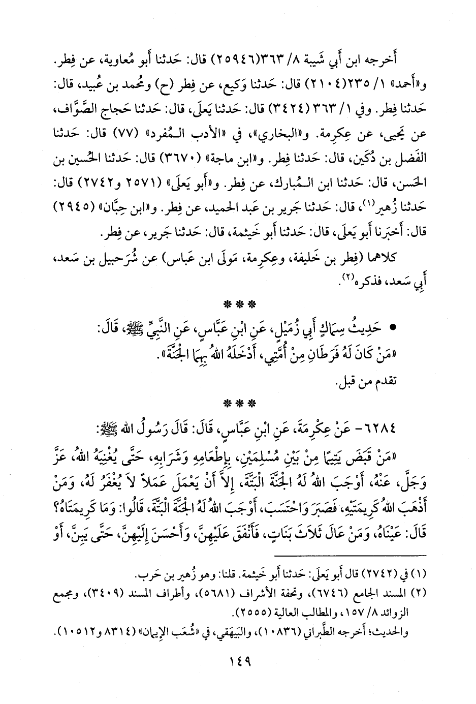 (¬٢) المسند الجامع (٦٧٤٦)، وتحفة الأشراف (٥٦٨١)، وأطراف المسند (٣٤٠٩)، ومَجمَع الزوائد ٨/ ١٥٧، والمطالب العالية (٢٥٥٥).