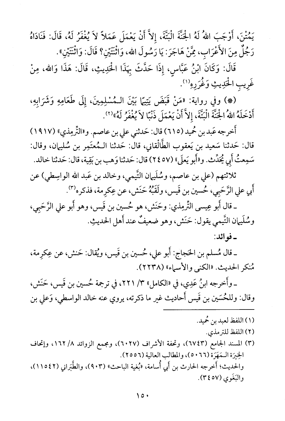- قلنا: إِسناده ضعيفٌ؛ قال مسلم بن الحجاج: أَبو علي، حسين بن قيس، ويقال: حنش، عن عكرمة، منكر الحديث. «الكنى والأسماء» (٢٢٣٨).