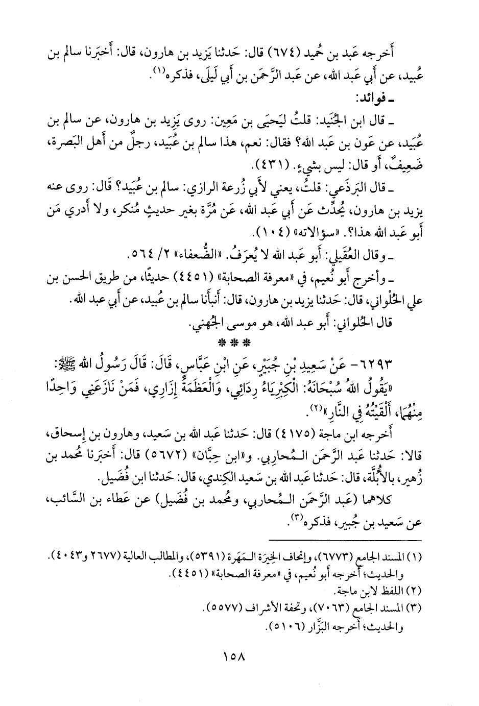 - قلنا: إِسناده ضعيفٌ؛ قال ابن الجنيد: قلت ليحيى بن مَعين: روى يزيد بن هارون، عن سالم بن عبيد، عن عون بن عبد الله؟ فقال: نعم، هذا سالم بن عبيد، رجل من أهل البصرة، ضعيف, أو قال: ليس بشيء. (٤٣١).