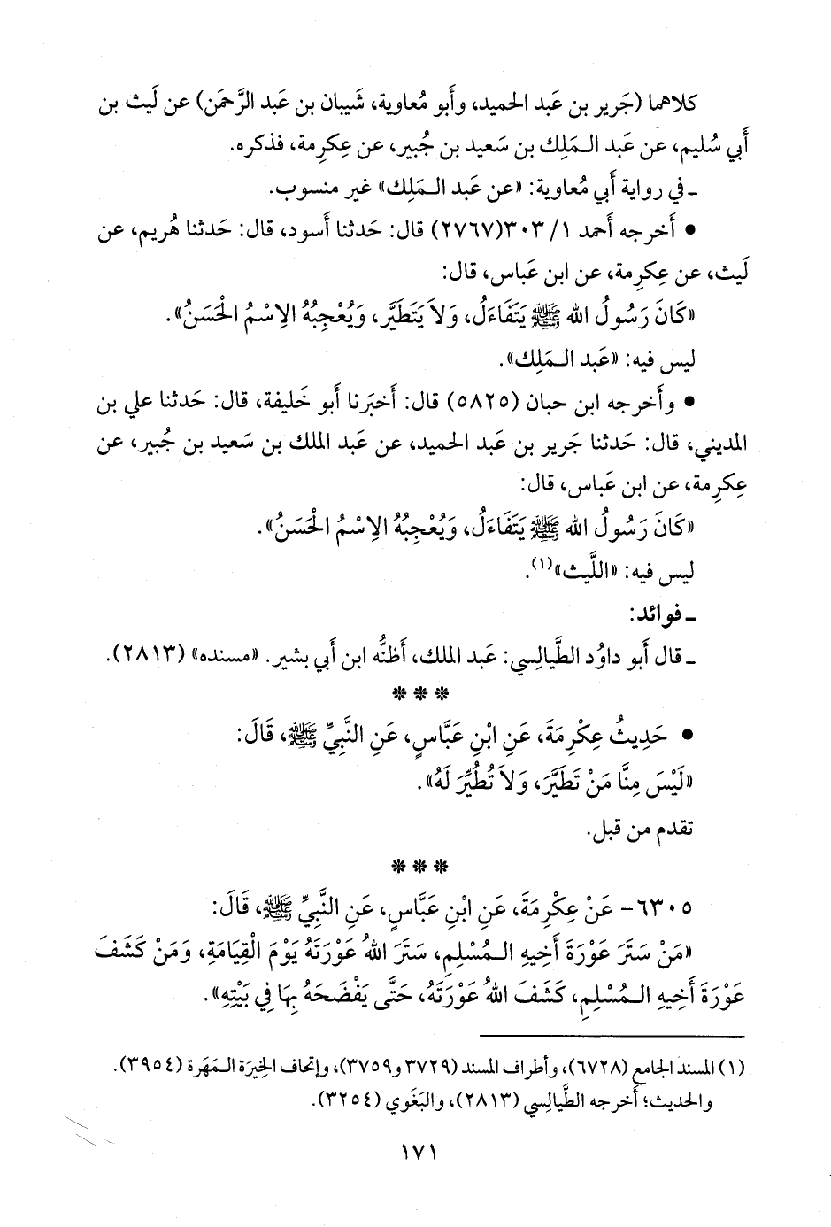 - أخرجه أبو داود الطيالسي (٢٨١٣) قال: حدثنا جرير، عن ليث بن أبي سُليم، عن عبد الملك، قال أبو داود: أظنه ابن أبي بشير، عن عكرمة، عن ابن عباس، أن النبي صَلى الله عَليه وسَلم كان يتفاءلُ ولا يَتطيرُ، ويُعجبُه الاِسمُ الحَسَن (¬١).